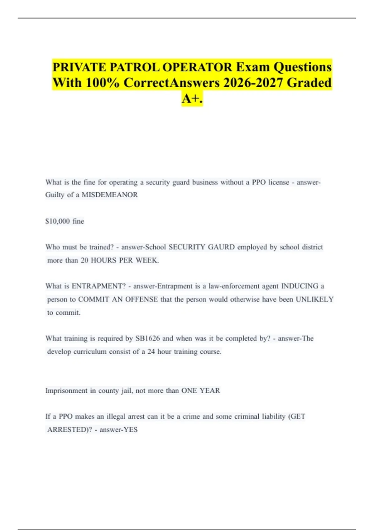 PRIVATE PATROL OPERATOR Exam Questions With 100% Correct Answers Graded A+. What mis mthe mfine mfor moperating ma msecurity mguard mbusiness mwithout ma mPPO mlicense m- manswerGuilty mof ma mMISDEMEANOR $10,000 mfine Who mmust mbe mtrained? m- manswer-School mSECURITY mGAURD memployed mby mschool mdistrict mmore mthan m20 mHOURS mPER mWEEK. What mis mENTRAPMENT? m- manswer-Entrapment mis ma mlaw-enforcement magent mINDUCING ma mperson mto mCOMMIT mAN mOFFENSE mthat mthe mperson mwould motherwise mhave mbeen mUNLIKELY mto mcommit. What mtraining mis mrequired mby mSB1626 mand mwhen mwas mit mbe mcompleted mby? m- manswer-The mdevelop mcurriculummconsist mof ma m24 mhour mtraining mcourse. Imprisonment min mcounty mjail, mnot mmore mthan mONE mYEAR If ma mPPO mmakes man millegal marrest mcan mit mbe ma mcrime mand msome mcriminal mliability m(GET mARRESTED)? m- manswer-YES Can mit mbe ma mtort mand mthere mbe msome mcivil mliability m(GET mSUED)? m- manswer-YES What mis man mINVOLUNTARY mDISCHARGE mof man memployee? m- manswer-Company's mdecision mto: 1. mTERMINATE man memployee 2. mFIRING/LAYING mOFF man memployee 3. mFIRE memployee What mis mthe mVOLUNTARY mDISCHARGE mof man memployee? m- manswer-1. mEmployee mdecides mto mLEAVE mor mQUIT mjob 2. mEmployee mQUITS mjob If ma mcommunity mcollege mis mlooking mto mhire ma mPPO mto mprovide mschool msecurity mservices, mwhat mspecial mtraining mis mrequired? m- manswer-Any mprivate msecurity mwho mworks mmore mthan m20 mhours mper mweek mperforming mschool msecurity mmust mfirst mcomplete ma mspecial m24 mhours mtraining mcourse. mThe mcourse mwas mdeveloped mby mBSIS min mconsultation mwith mPOST mknown mas mSB m1626 mTRAINING; mBPC m7583.6 How mcan mI mobtain ma mcopy mof mthe mapproved mtraining mcurriculum? m- manswer-The mcurriculummcan mbe mobtained mvia mthe mInternet mat Who mis mauthorized mto mteach mthe mrequired mcourse? m- manswer-SB m1626 mdoes mnot mestablish mcriteria mfor minstructors mof mcourse Can mschool mdistricts mteach mthe mcourse? m- manswer-YES mAny mperson mdesignated mby mthe mlocal meducation magency mmay mteach mthe mcourse What mregulatory mauthority mdoes mthe mCalifornia mDepartment mof mConsumer mAffairs mBSIS mand mthe mCalifornia mDepartment mof mEducation mhave mwith mrespect mto mSB m1626? m- manswer-Both magencies mhave mthe msecurity mguard mor mofficer mwho mworks mmore mthan m20 mhours mper mweek mperforming mthe mfunction mof mschool msecurity What madministrative mrecords mif many mmust mbe mkept mby mschool mdistricts min morder mto mcomply mwith mSB m1626? m- manswer-SB m1626 mdoes mnot mmandate mwhat mrecords mmust mbe mkept. mWe mrecommend mthat mlocal meducation magency's mkeep ma mrecord min mwhich memployees mcomplete mthe mcourse, mthe mcourse mdate, mthe mname mof mthe minstructor, mand mthat ma mrecord mof mcourse mcompletion mbe mgiven mto mthe mattendees. Are mschool mdistricts mrequired mto missue mcertificates mto mdistrict msecurity mpersonnel mwho mtake mand mcomplete mthe mtraining? m- manswer-NO Does mSB m1626 mprovide mfunding mfor mdistricts mto mtrain mthe mpersonnel? m- manswer-NO What mfunds mare mavailable mto mschool mdistricts mto mpay mfor mSB m1626 mtraining, msince mthe mbill mdoes mnot mprovide mfunds mto mpay mfor? m- manswer-AB m1113 mSCHOOL mSAFETY mBLOCK mGRANT mFUNDS and TITLE m4 mSAFE mand mDRUG mFREE mSCHOOLS mand mCOMMUNITIES mACT mFUNDS Is mcompliance mwith mSB m1626 mrequirements ma mmandated mcost mthat mcan mbe mrecovered mby mdistricts mvia mpetitioning mthe mCommission mon mState mMandates mfor mpayment? m- manswer-The mmatter mwould mhave mto mbe mdecided mby mthe mCommission min msuch mmatters mare mconsidered mon ma mcase mby mcase mbasis Our mschool mdistrict msecurity mpersonnel mwho mprovide mschool msecurity mrequired mby mSB m1626 mto mmeet mthe msame mtraining mrequirements mas mguards mprovide mschool msecurity mand mare memployed mby mPPOs? m- manswer-YES Does mSB m1626 midentify ma mstate magency mresponsible mto massure mcompliance? m- manswer-NO