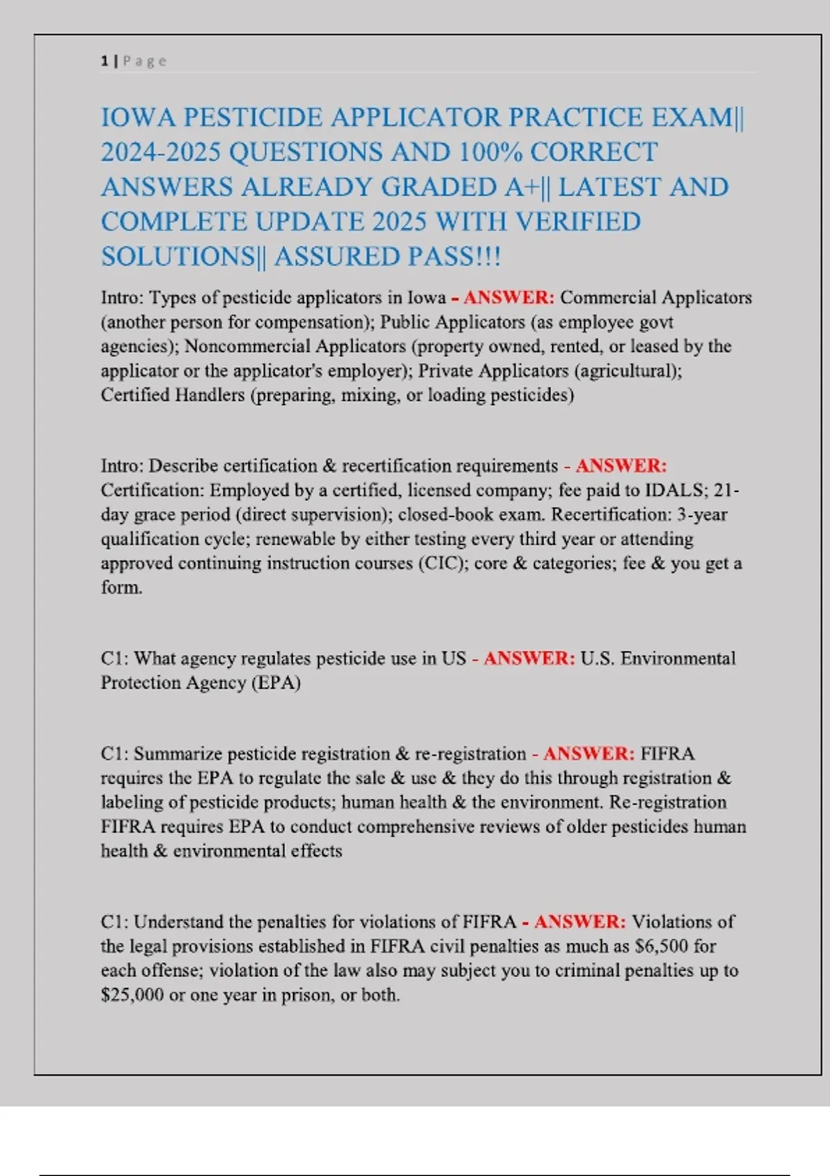 Iowa Pesticide Applicator Practice Exam, Iowa commercial pesticide exam prep, Pesticide practice questions and answers Iowa, Verified answers pesticide practice exam, Integrated Pest Management (IPM) practice review, Pesticide safety protocols Iowa, Pesticide application techniques study, Iowa pesticide license prep, Environmental compliance pesticide exam, Commercial pesticide certification practice, Agricultural pest control practice exam, Iowa pesticide mock exam PDF, Pesticide exam readiness guide Iowa, Certified pesticide applicator practice, Iowa state pesticide regulations review, Pesticide exam study material PDF, Iowa pesticide exam practice questions, Verified pesticide applicator practice answers, Pesticide licensure practice test, Iowa pesticide exam prep guide.