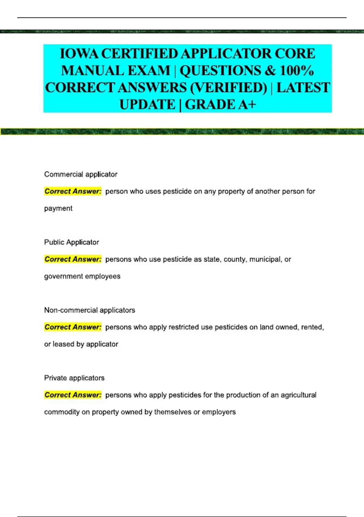 Iowa Certified Applicator Core Manual Exam, Iowa core manual exam prep, Certified applicator study guide Iowa, Core manual exam questions and answers, Verified answers Iowa core exam, State regulations and safety protocols, Technical procedures Iowa exam prep, Practical applicator exam study, Iowa licensing exam core manual, Core concepts and procedures review, Iowa applicator mock exam, Environmental compliance exam Iowa, Certified pesticide applicator readiness guide, Core manual exam practice PDF, Iowa certification exam prep, Applicator licensing study material, Iowa core exam verified answers, Professional applicator exam prep, Core manual exam questions PDF, Iowa exam preparation guide.