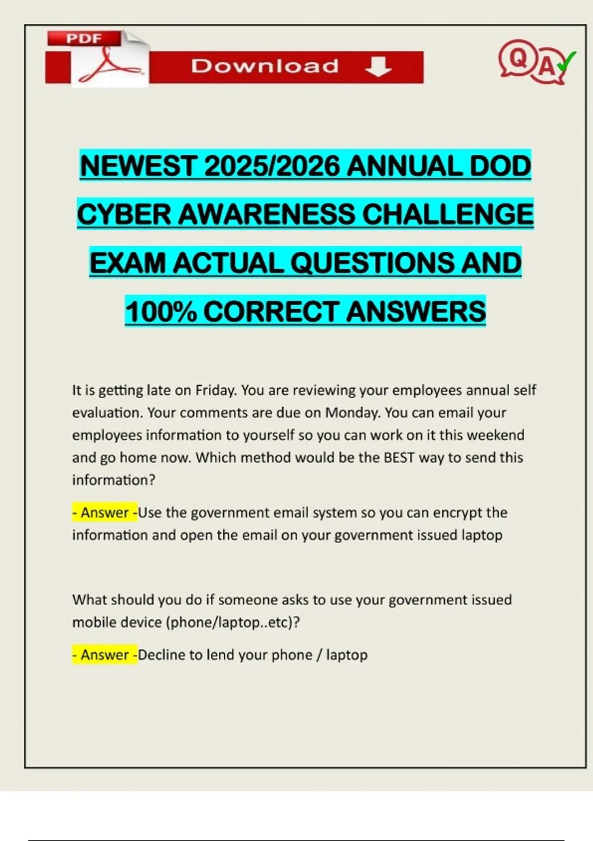 NEWEST 2025/2026 ANNUAL DOD CYBER AWARENESS CHALLENGE EXAM ACTUAL QUESTIONS AND 100% CORRECT ANSWERS It is getting late on Friday. You are reviewing your employees annual self evaluation. Your comments are due on Monday. You can email your employees information to yourself so you can work on it this weekend and go home now. Which method would be the BEST way to send this information? - Answer -Use the government email system so you can encrypt the information and open the email on your government issued laptop What should you do if someone asks to use your government issued mobile device (phone/laptop..etc)? - Answer -Decline to lend your phone / laptopNeed assistance on Online classes, Exams & Assignments? Reach out for instant help!! Full Course Assistance, Plagiarism-free Essay Writing, Research Paper, Dissertation, Discussion Posts, etc…. Confidential & Secure services. Tutors are available for all subjects! Email now at: Where should you store PII / PHI? - Answer -Information should be secured in a cabinet or container while not in use Of the following, which is NOT an intelligence community mandate for passwords? - Answer -Maximum password age of 45 days Which of the following is NOT Government computer misuse? - Answer -Checking work email