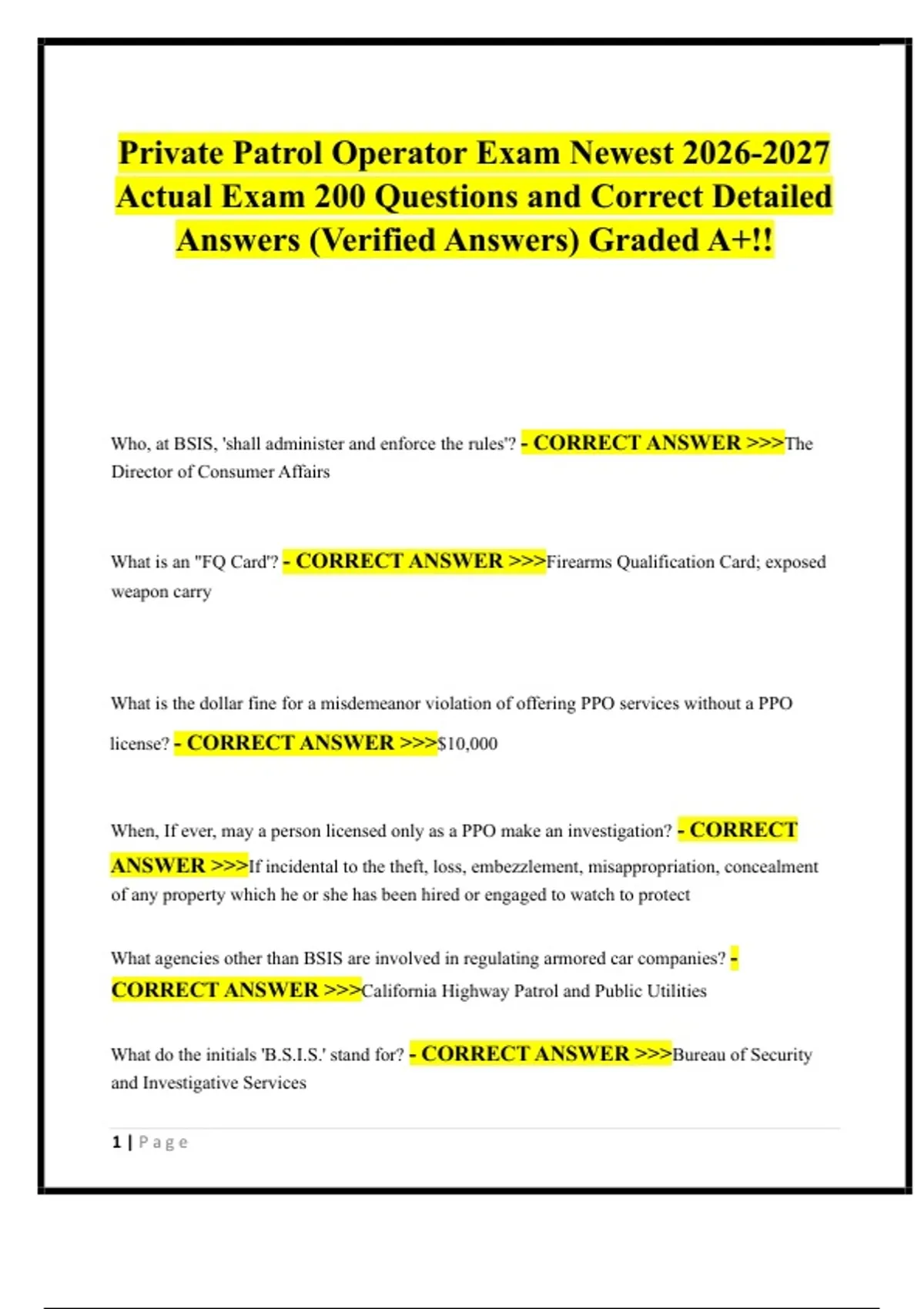 Private Patrol Operator Exam Newest Actual Exam 200 Questions and Correct Detailed Answers (Verified Answers) Graded A+!! Who, at BSIS, 'shall administer and enforce the rules'? - CORRECT ANSWER >>>The Director of Consumer Affairs What is an "FQ Card'? - CORRECT ANSWER >>>Firearms Qualification Card; exposed weapon carry What is the dollar fine for a misdemeanor violation of offering PPO services without a PPO license? - CORRECT ANSWER >>>$10,000 When, If ever, may a person licensed only as a PPO make an investigation? - CORRECT ANSWER >>>If incidental to the theft, loss, embezzlement, misappropriation, concealment of any property which he or she has been hired or engaged to watch to protect What agencies other than BSIS are involved in regulating armored car companies? - CORRECT ANSWER >>>California Highway Patrol and Public Utilities What do the initials 'B.S.I.S.' stand for? - CORRECT ANSWER >>>Bureau of Security and Investigative Services 2 | P a g e Carrying a gun concealed under a shirt is usually what type of a crime? - CORRECT ANSWER >>>Misdemeanor If a person without a PPO license offers security or protection services to the public, What type of crime has been committed? - CORRECT ANSWER >>>A misdemeanor violation of the B&P Code Carrying a set of 'brass knuckles' in your pocket is usually what type of crime? - CORRECT ANSWER >>>Felony How much imprisonment might come from a misdemeanor conviction? - CORRECT ANSWER >>>Up to a year imprisonment How much imprisonment might come from a felony conviction? - CORRECT ANSWER >>>One year or more imprisonment If a person is convicted of providing PPO services without a license, he/she can not be issued a PPO license for what time period following the conviction? - CORRECT ANSWER >>>One year If a person is convicted a second time of proving PPO services without a license, he/she can not be issued a PPO license for what time period following this second conviction? - CORRECT ANSWER >>>Five years An applicant for a PPO license must be at least how old? - CORRECT ANSWER >>>18 years of age 3 | P a g e Where must the PPO license be posted? - CORRECT ANSWER >>>Posted in a conspicuous place in the principal place of business