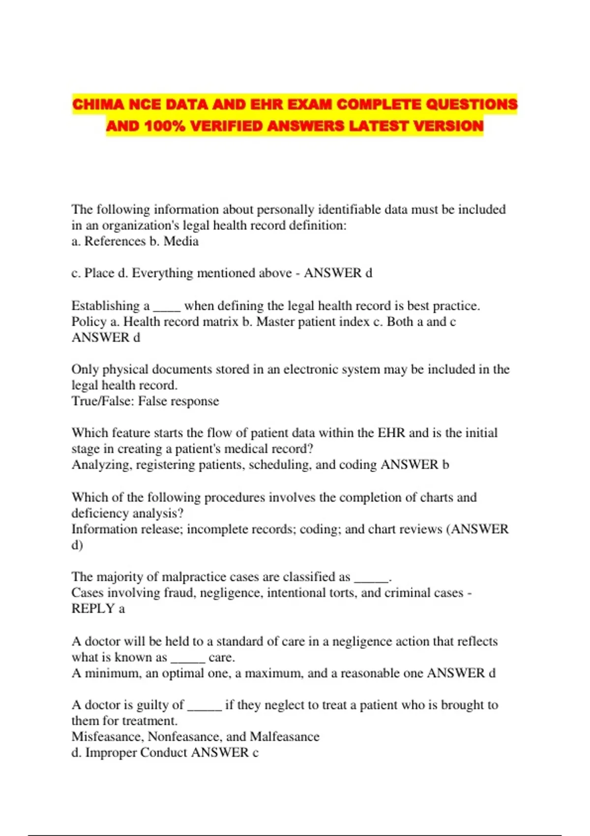 CHIMA NCE DATA AND EHR EXAM COMPLETE QUESTIONS AND 100% VERIFIED ANSWERS LATEST VERSION....