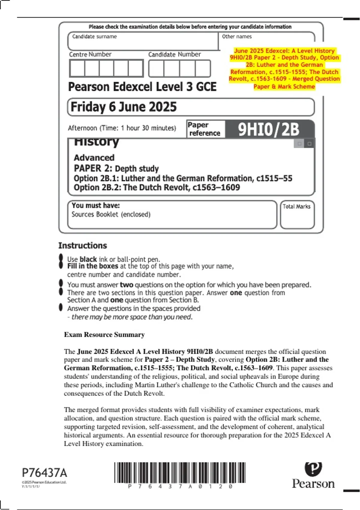 June 2025 Edexcel: A Level History 9HI0/2B Paper 2 – Depth Study, Option 2B: Luther and the German Reformation, c.1515–1555; The Dutch Revolt, c.1563–1609 – Merged Question Paper & Mark Scheme Exam Resource Summary The June 2025 Edexcel A Level History 9HI0/2B document merges the official question paper and mark scheme for Paper 2 – Depth Study, covering Option 2B: Luther and the German Reformation, c.1515–1555; The Dutch Revolt, c.1563–1609. This paper assesses students' understanding of the religious, political, and social upheavals in Europe during these periods, including Martin Luther's challenge to the Catholic Church and the causes and consequences of the Dutch Revolt. The merged format provides students with full visibility of examiner expectations, mark allocation, and question structure. Each question is paired with the official mark scheme, supporting targeted revision, self-assessment, and the development of coherent, analytical historical arguments. An essential resource for thorough preparation for the 2025 Edexcel A Level History examination. 2 ■■■■ SECTION A Choose EITHER Question 1 OR Question 2 for which you have been prepared. You must start your answer on page 3. Option 2B.1: Luther and the German Reformation, c1515–55 Study Sources 1 and 2 in the Sources Booklet before you answer this question. 1 How far could the historian make use of Sources 1 and 2 together to investigate the controversy caused by the sale of indulgences in Germany in the years 1515–18? Explain your answer, using both sources, the information given about them and your own knowledge of the historical context. (Tot