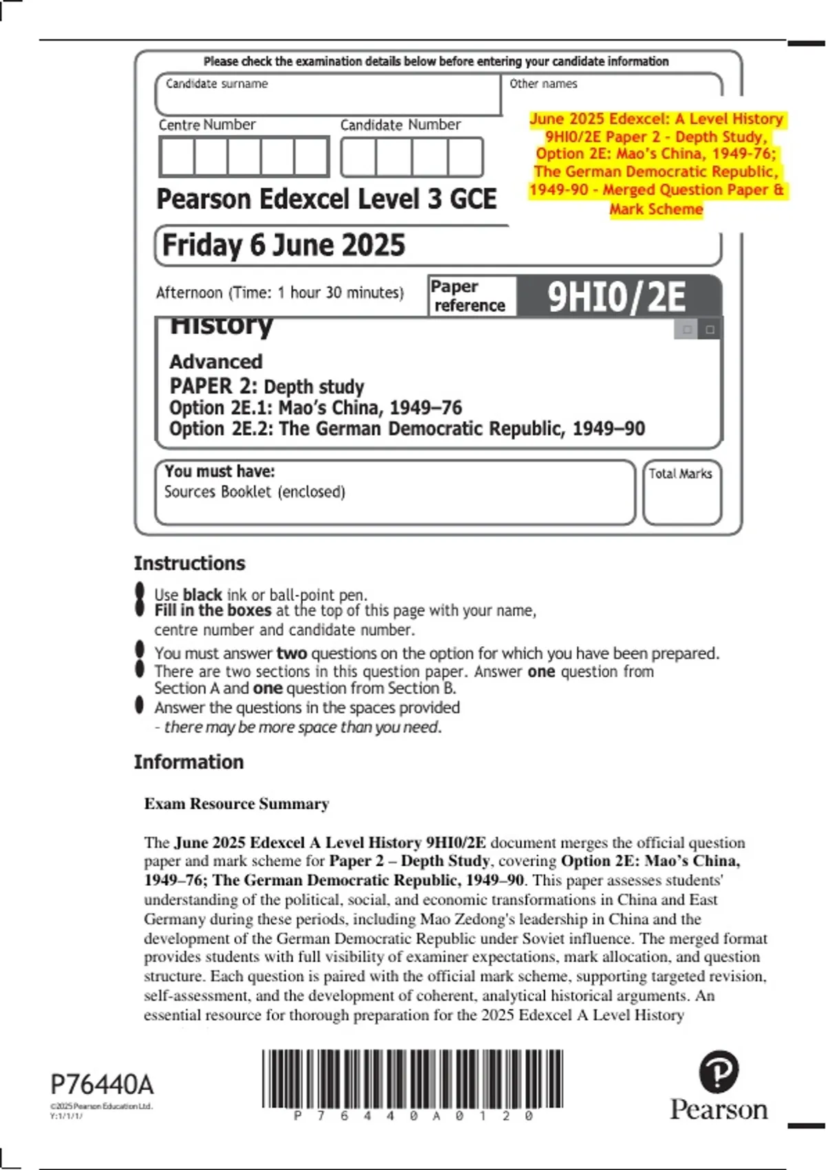 June 2025 Edexcel: A Level History 9HI0/2E Paper 2 – Depth Study, Option 2E: Mao’s China, 1949–76; The German Democratic Republic, 1949–90 – Merged Question Paper & Mark Scheme