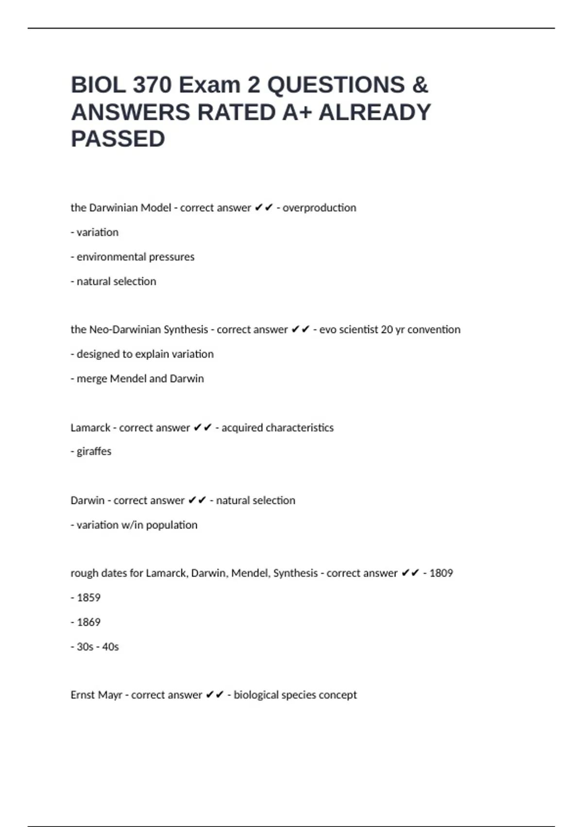 rough dates for Lamarck, Darwin, Mendel, Synthesis - correct answer ✔✔ - 1809