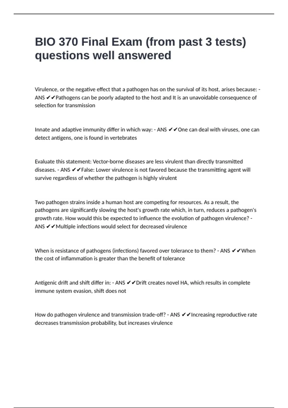diseases. - ANS ✔✔False: Lower virulence is not favored because the transmitting agent will