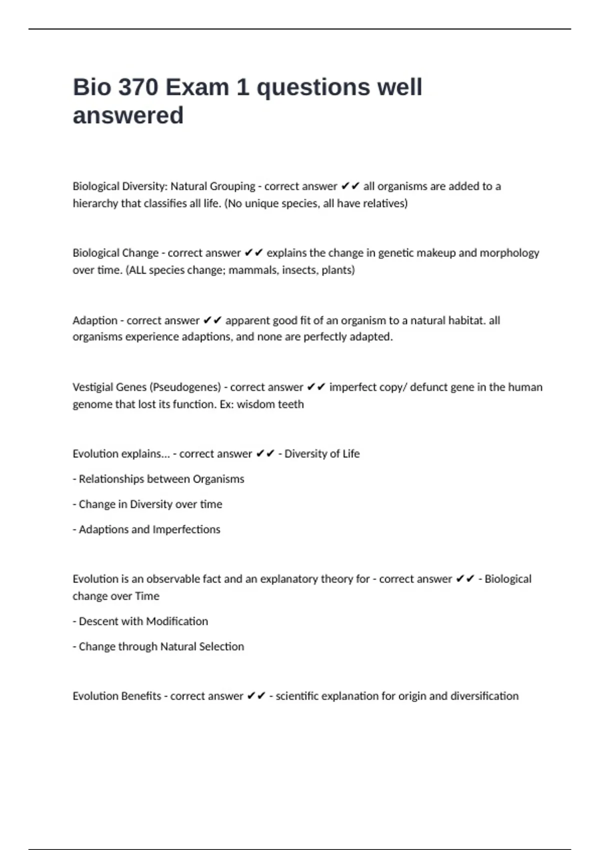 Evolution explains... - correct answer ✔✔ - Diversity of Life
