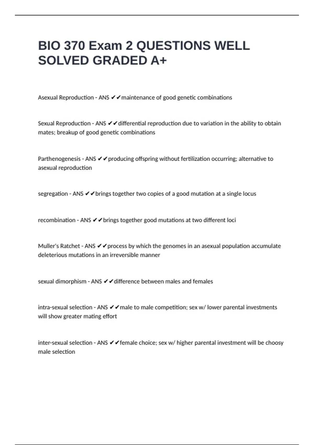 BIO 370 Exam 2 QUESTIONS WELL SOLVED GRADED A+