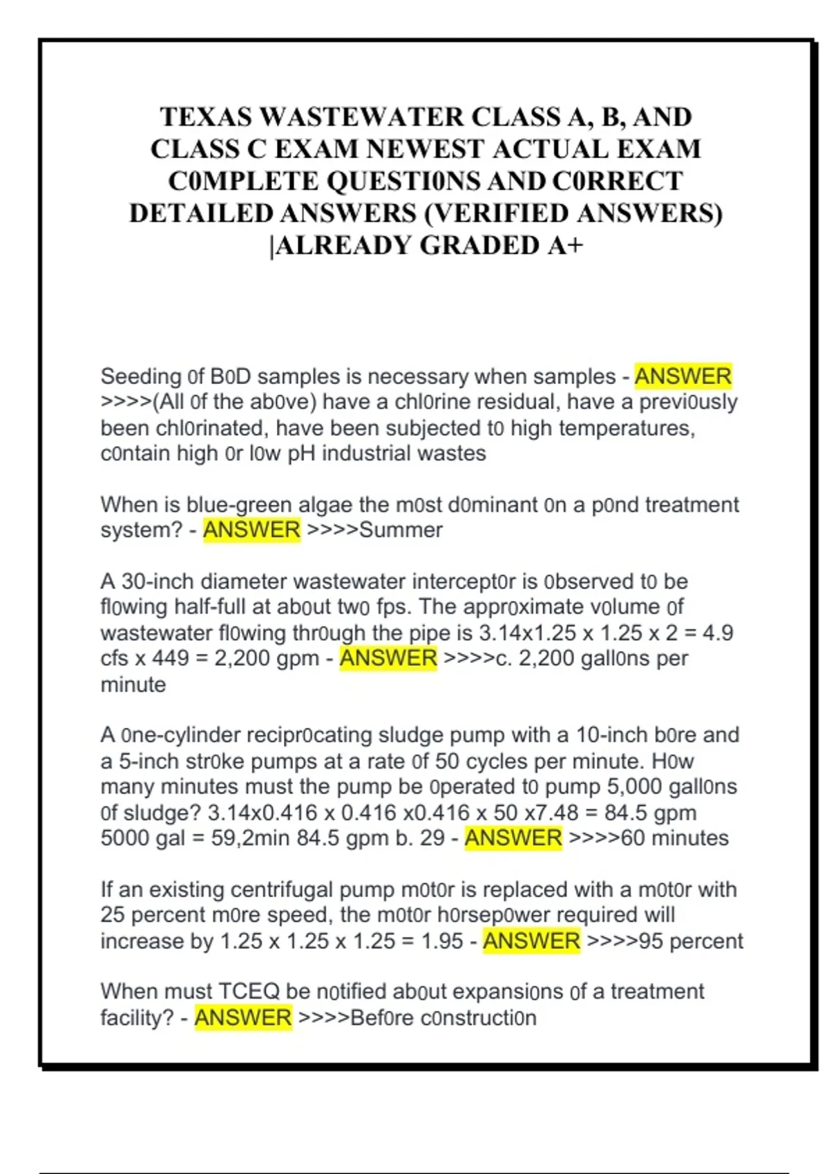 This Texas Wastewater Operator Certification Exam prep includes complete verified questions and correct detailed answers for Class A, B, and C levels. Designed according to the latest Texas Commission on Environmental Quality (TCEQ) guidelines, this material covers wastewater treatment processes, safety, disinfection, solids handling, laboratory procedures, and system operation standards. It’s an ideal resource for operators preparing for certification or advancement, providing accurate explanations and practical examples to ensure an easy and confident pass.