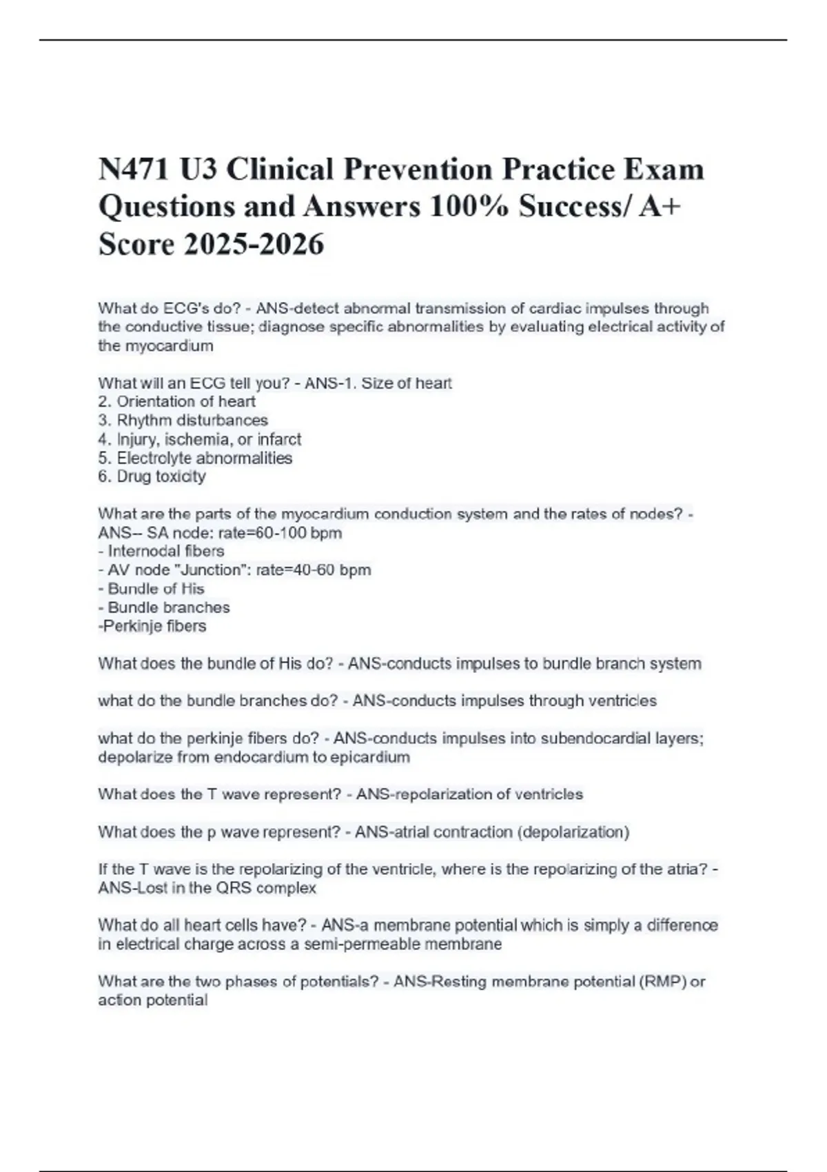 N471 U3 Clinical Prevention Practice Exam Questions and Answers 100% Success/ A+ Score What do ECG's do? - ANS-detect abnormal transmission of cardiac impulses through the conductive tissue; diagnose specific abnormalities by evaluating electrical activity of the myocardium What will an ECG tell you? - ANS-1. Size of heart 2. Orientation of heart 3. Rhythm disturbances 4. Injury, ischemia, or infarct 5. Electrolyte abnormalities 6. Drug toxicity What are the parts of the myocardium conduction system and the rates of nodes? - ANS-- SA node: rate=60-100 bpm - Internodal fibers - AV node "Junction": rate=40-60 bpm - Bundle of His - Bundle branches -Perkinje fibers What does the bundle of His do? - ANS-conducts impulses to bundle branch system what do the bundle branches do? - ANS-conducts impulses through ventricles what do the perkinje fibers do? - ANS-conducts impulses into subendocardial layers; depolarize from endocardium to epicardium What does the T wave represent? - ANS-repolarization of ventricles What does the p wave represent? - ANS-atrial contraction (depolarization) If the T wave is the repolarizing of the ventricle, where is the repolarizing of the atria? - ANS-Lost in the QRS complex What do all heart cells have? - ANS-a membrane potential which is simply a difference in electrical charge across a semi-permeable membrane What are the two phases of potentials? - ANS-Resting membrane potential (RMP) or action potential What are the two stages of action potentials? - ANS-depolarization and repolarization What is automaticity? - ANS-the ability to spontaneously depolarize what is rhythmicity? - ANS-the ability to depolarize regularly What is refractoriness? - ANS-the state of a cell during repolarization when cells cannot depolarize regardless of the intensity of the stimulus or require a much greater stimulus than normal What is the Na+ concentration like? - ANS-greater outside the cell than inside what is the K+ concentration like? - ANS-greater inside the cell than outside What causes changes in resting membrane potential? - ANS-chemical, electrical, or mechanical stimulation What are the two types of cells in action potential? - ANS-Myocardial cell and pacemaker cell What is the process of action potential in a myocardial cell? - ANS-1. Stimulus hits the resting membrane 2. Influx of Na+ produces rapid depolarization 3. Initial repolarization as some K+ leaves the cell 4. Slow influx of Ca+ keeps inside positive (Ca entering the cell provides for release of intra-cardiac Ca stores and muscle contraction) 5. Repolarization phase; inactivation of slow Ca channel begins preventing further influx of Ca; K+ continues to leave the cell; leads to cell becoming more negative, leading to reestablishment of the RMP 6. Excess Na+ that entered the cell during depolarization is removed via the Na-K Pump; inside the cell returns to a negative state and outside a positive in preparation for the next stimulus which will lead to depolarization What is the process of action potential in pacemaker cells? - ANS-1. a slow influx of Na+ results in a gradual incline 2. depolarization and repolarization occur due to a steady influx of Na and efflux of K in these specialized cell membranes *they require NO outside stimulus to depolarize spontaneously. What do pacemaker cells provide? - ANS-the electrical stimulus for depolarization of the myocardial cells What are refractory periods and the various types? - ANS-where myocardial cells action potentials are resistant to a new stimulus Absolute refractory Relative refractory vulnerable period normal excitability What is absolute refractory period? - ANS-Phases 0, 1, and 2 where the myocardial cells cannot respond to another impulse because of total depolarization what is relative refractory? - ANS-Phase 3 during repolarization where the cell may respond to an impulse if the intensity of the impulse is above normal threshold What is the vulnerable period? - ANS-the end phase 3 to phase 4 where there is increased excitability during which a weaker than normal impulse can provoke repetitive depolarizations what is Normal excitability - ANS-phase 4 where there is no refractoriness present so excitability is normal Where is the P-wave on the ECG from? - ANS-the SA node which has automaticity that starts the AP of the myocardial cells around the SA node What does the SA node act as? - ANS-the pacemaker for the heart What does the T-wave of the ECG correspond closely to? - ANS-phase 3 of the myocardial cells action potential What are the two mechanisms of dysrhythmias? - ANS-abnormal automaticity and re-entry what is abnormal automaticity? - ANS-is present in pacemaker cells only and is the property of spontaneous depolarizations resulting from altered impulse formation What are the two alterations in nodal cells action potential? - ANS-- increase slope: leads to tachycardias and premature beats - decreased slope: leads to bradycardias and latent pacemakers Do myocardial cells possess automaticity? - ANS-NO; they need outside stimulus What is Re-entry and when does it occur? - ANS-is impaired conduction where there are branching pathways and a unidirectional block present occurs in ischemic conditions what can re-entry create? - ANS-an isolated ectopic beat or a series of fast, repetitive beats (tachycardias) What is a vector? - ANS-when many cardiac cells' membrane potentials change concurrently forming an electrical force that has both direction and magnitude. What is a vector recorded by and what does it record? - ANS-recorded by an electrode on the chest surface; records only electrical activity *When a vector is detected, the electrode records a deflection from baseline What does a vector traveling toward a positive electrode produce? - ANS-a positive deflection What does a vector traveling away from a positive electrode produce? - ANS-a negative deflection What are the 4 types of leads? - ANS-limb, augmented, chest, MCL1 How many limb leads are there, wha