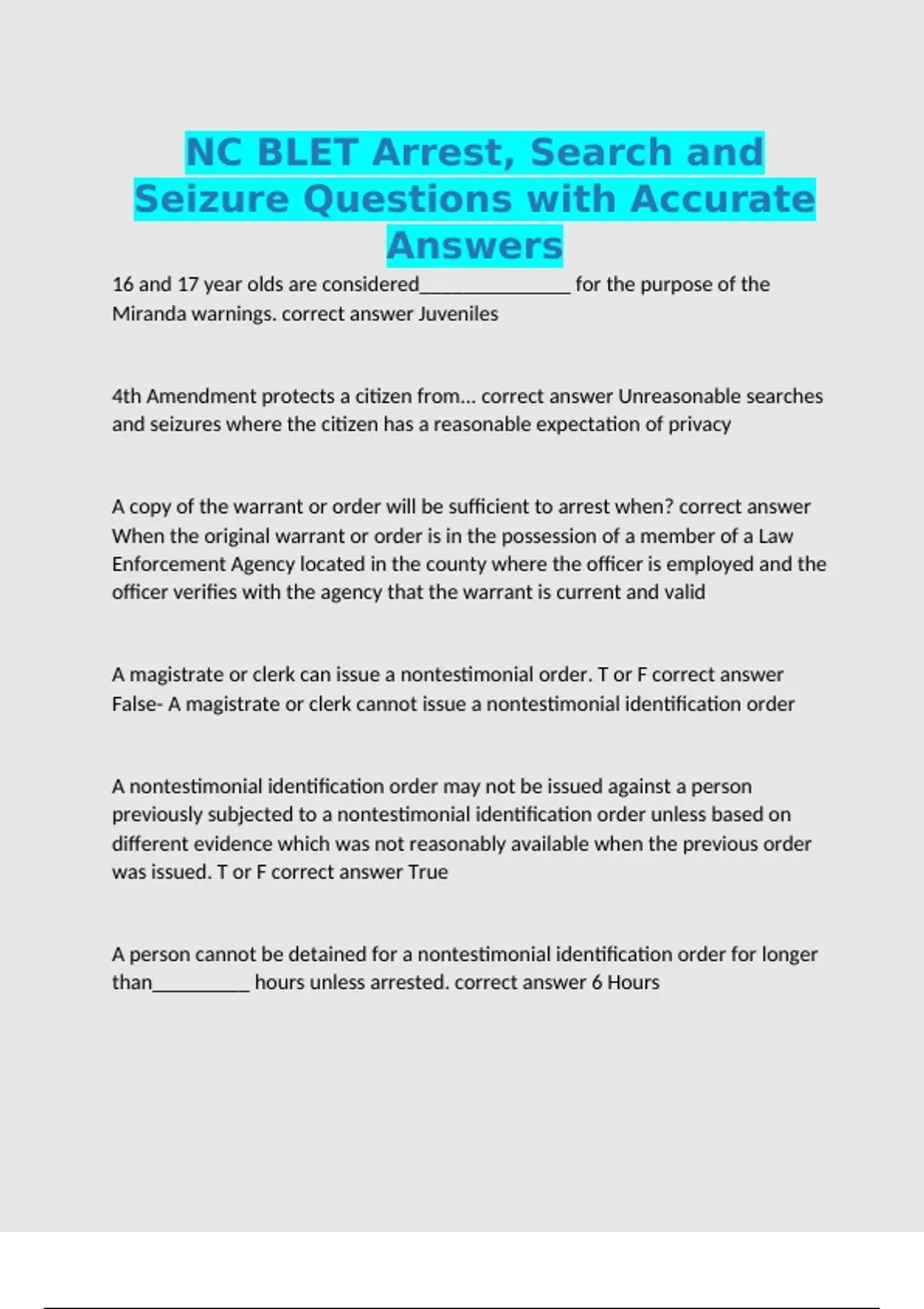 NC BLET Arrest, Search and Seizure Questions with Accurate Answers