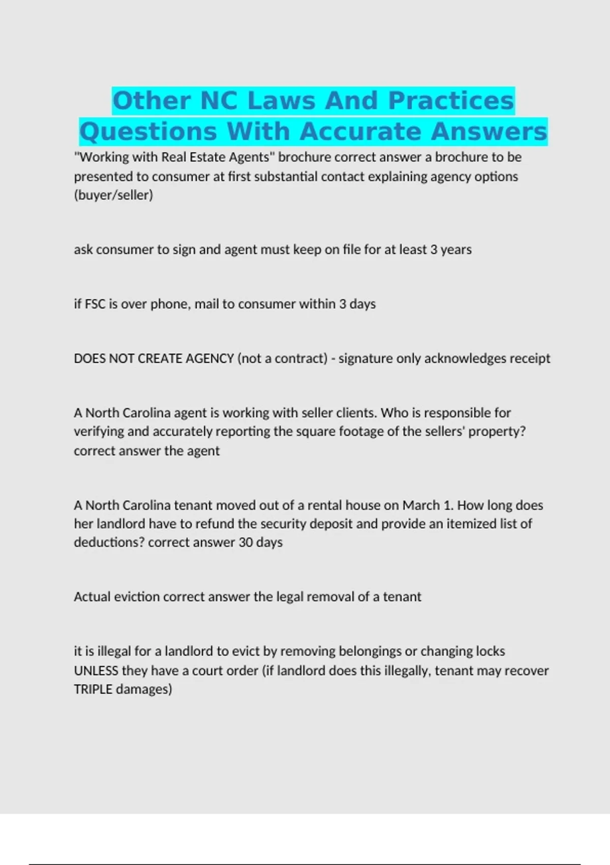 "Working with Real Estate Agents" brochure correct answer a brochure to be presented to consumer at first substantial contact explaining agency options (buyer/seller) ask consumer to sign and agent must keep on file for at least 3 years if FSC is over phone, mail to consumer within 3 days DOES NOT CREATE AGENCY (not a contract) - signature only acknowledges receipt A North Carolina agent is working with seller clients. Who is responsible for verifying and accurately reporting the square footage of the sellers' property? correct answer the agent A North Carolina tenant moved out of a rental house on March 1. How long does her landlord have to refund the security deposit and provide an itemized list of deductions? correct answer 30 days Actual eviction correct answer the legal removal of a tenant it is illegal for a landlord to evict by removing belongings or changing locks UNLESS they have a court order (if landlord does this illegally, tenant may recover TRIPLE damages)