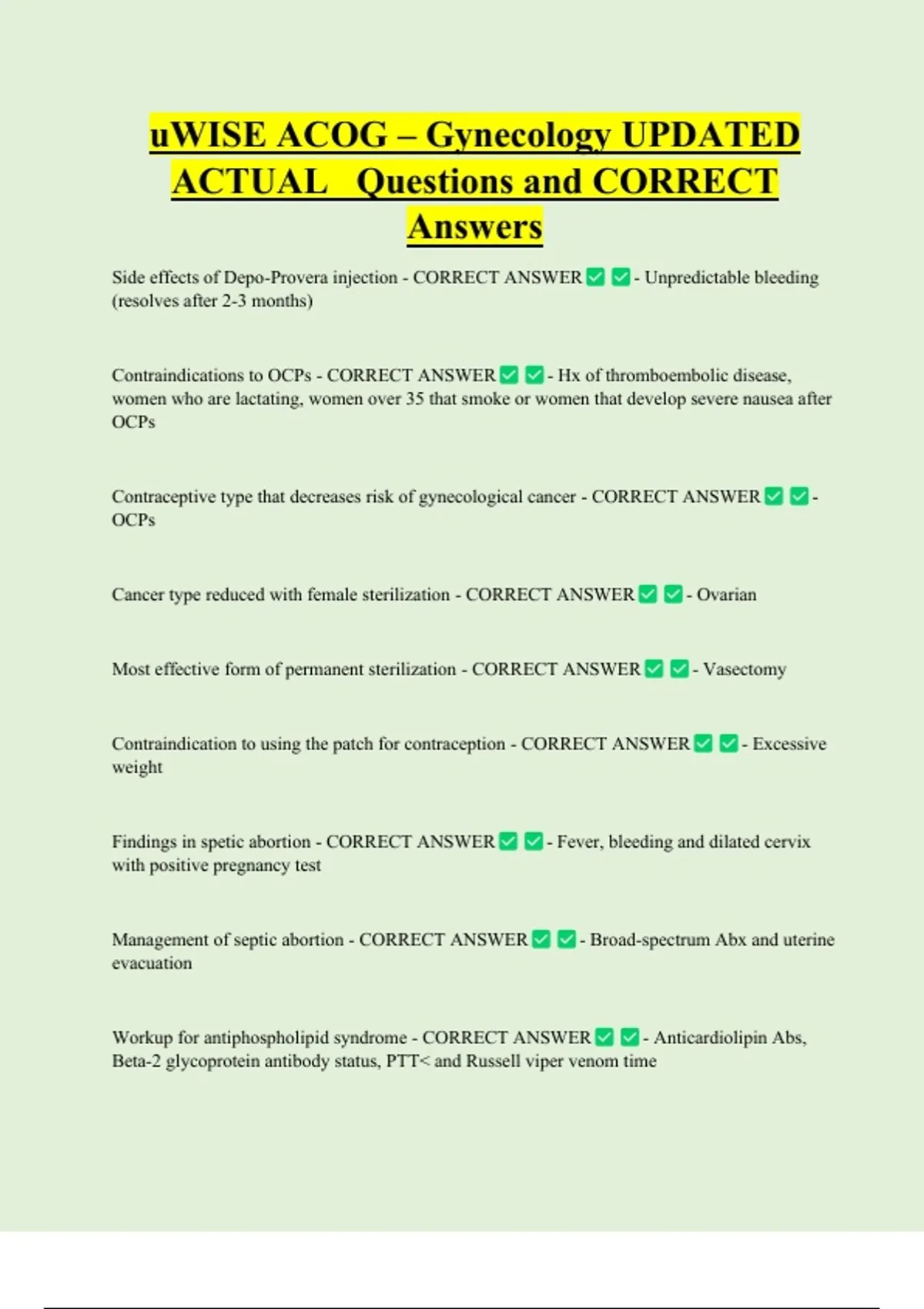 uWISE ACOG – Gynecology UPDATED ACTUAL Questions and CORRECT Answers