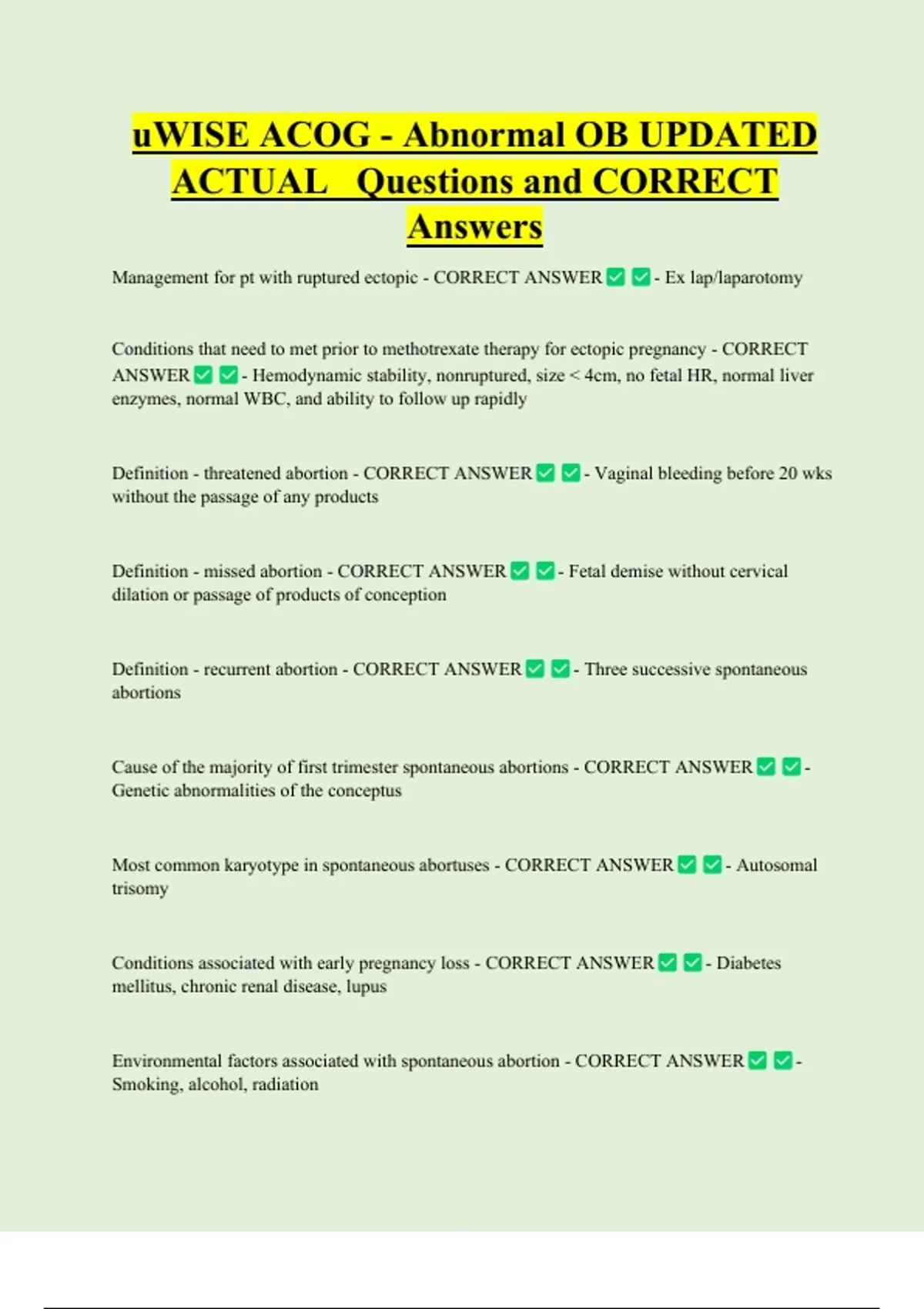 uWISE ACOG - Abnormal OB UPDATED ACTUAL Questions and CORRECT Answers