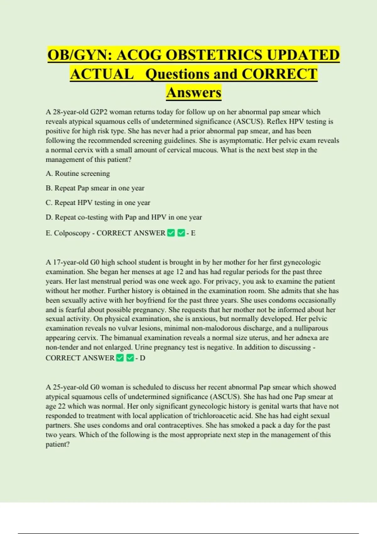 E. Colposcopy - CORRECT ANSWER -E