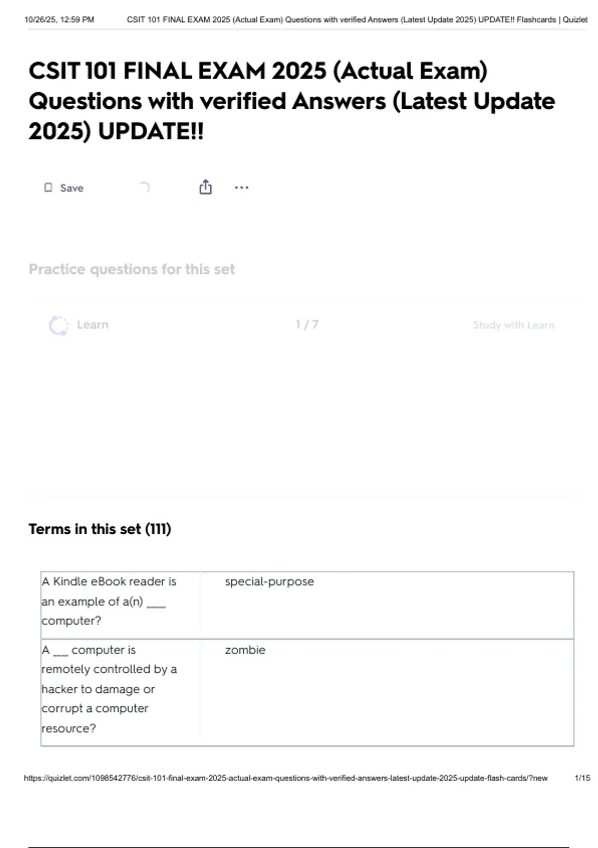 , 10/26/25, 12:59 PM CSIT 101 FINAL EXAM 2025 (Actual Exam) Questions with verified Answers (Latest Update 2025) UPDATE!! Flashcards | Quizlet