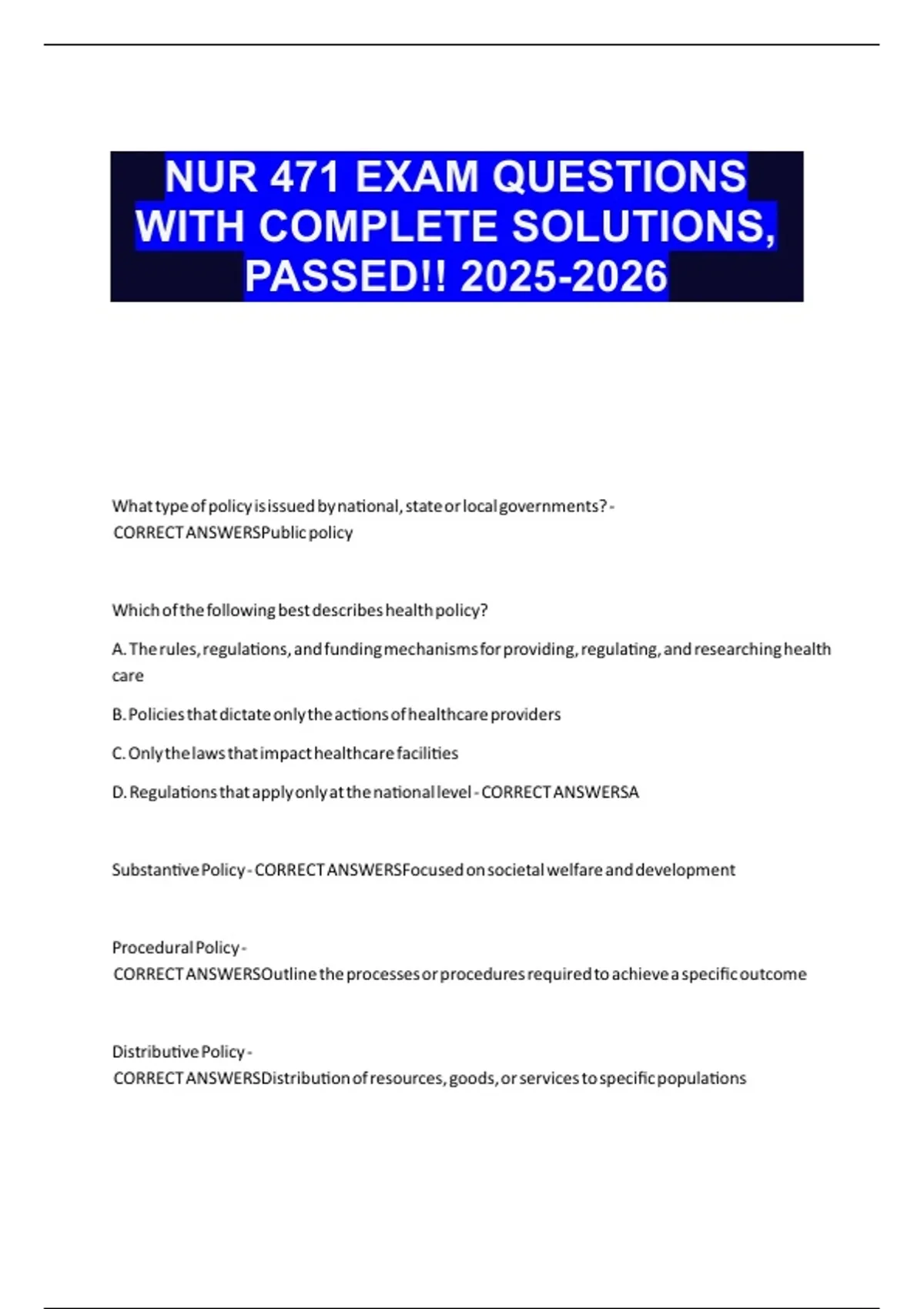 NUR 471 EXAM QUESTIONS WITH COMPLETE SOLUTIONS, PASSED!!
