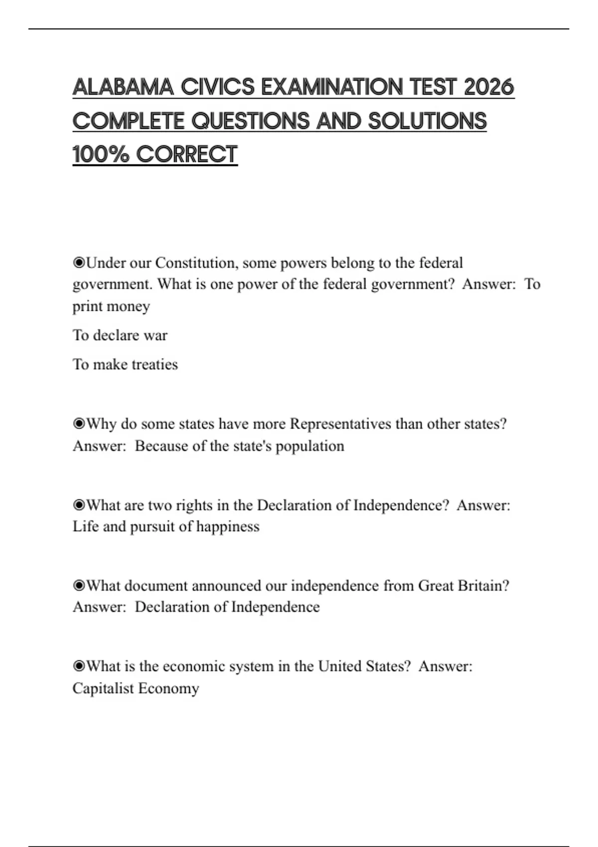 ALABAMA CIVICS EXAMINATION TEST 2026 COMPLETE QUESTIONS AND SOLUTIONS 100% CORRECT