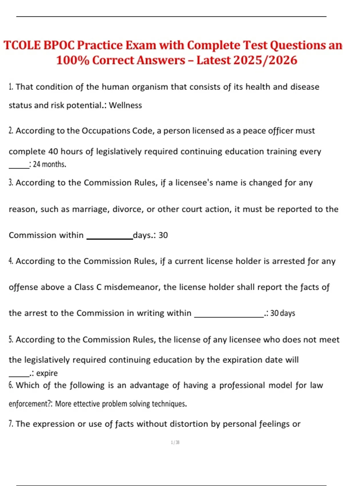 This document includes the complete set of practice test questions and 100% correct answers for the TCOLE Basic Peace Officer Course (BPOC) exam for the 2025/2026 certification cycle. It thoroughly covers all core areas of peace officer training, including Texas criminal law, patrol procedures, use of force, ethics, report writing, communication, and victims’ rights. Designed for cadets and officers preparing for the official TCOLE licensing exam, this guide provides accurate, up-to-date material aligned with current Texas Commission on Law Enforcement standards.