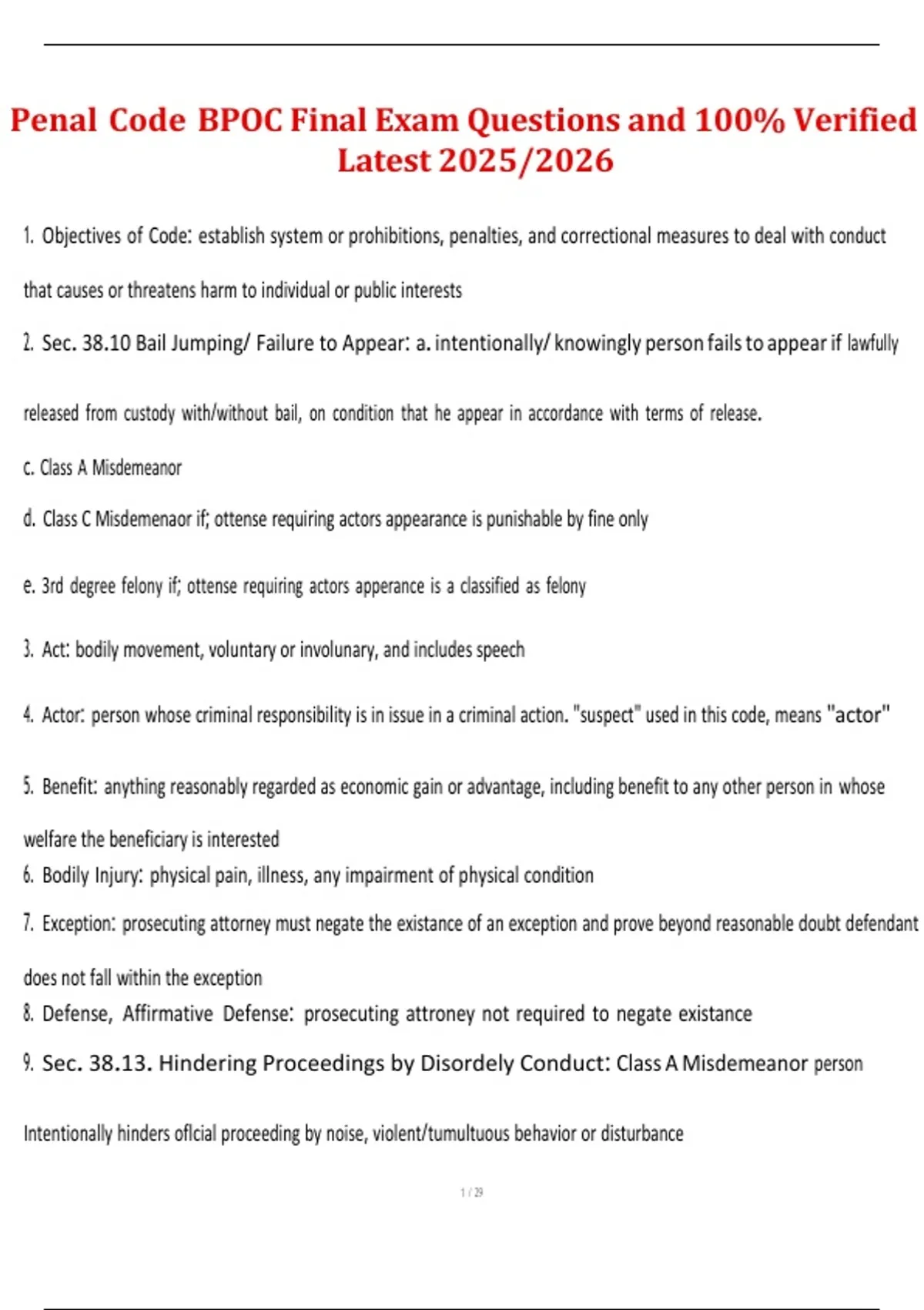 This document provides the verified final exam questions and answers for the TCOLE Basic Peace Officer Course (BPOC) – Penal Code module for the 2025/2026 training year. It covers essential Texas Penal Code sections, including crimes against persons, property offenses, public order crimes, criminal responsibility, defenses, and punishments. Ideal for cadets preparing for the state licensing exam, this study guide ensures accurate, up-to-date explanations aligned with the Texas Commission on Law Enforcement (TCOLE) curriculum and current state law.