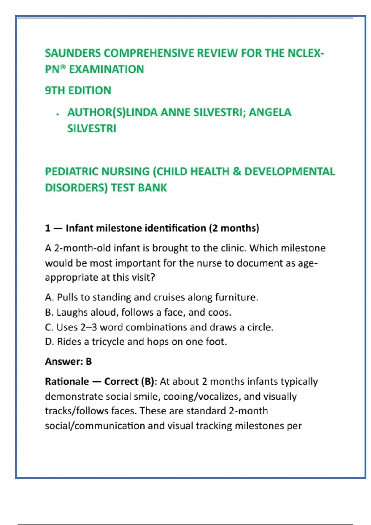Rationale — Correct (B): At about 2 months infants typically