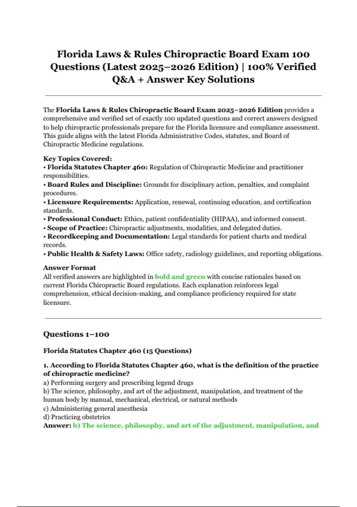 This document contains the verified 2025–2026 edition of the Florida Laws & Rules Chiropractic Board Exam preparation material. It features 100 updated questions with accurate answers and explanations aligned with current Florida Administrative Codes, statutes, and Board of Chiropractic Medicine regulations. The content ensures full coverage of legal, ethical, and procedural topics relevant to chiropractic licensure and compliance in the state of Florida.