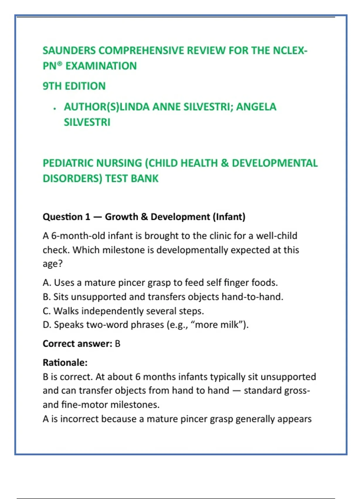 B is correct. At about 6 months infants typically sit unsupported