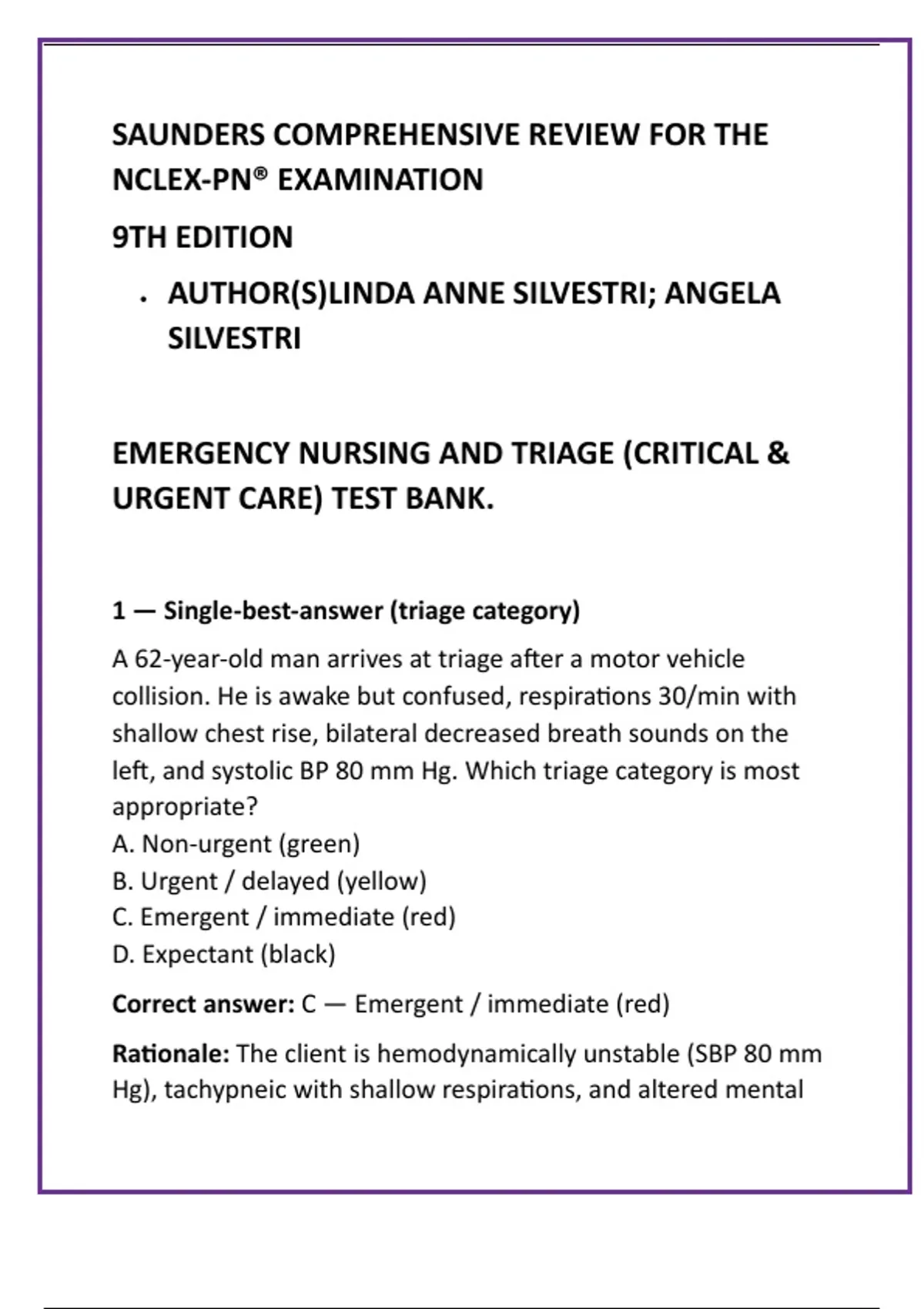 Saunders NCLEX-RN Emergency Nursing & Triage Test Bank | 2025 NGN-Style Questions + Detailed Rationales Meta Description (150–160 characters) Master Emergency Nursing & Triage with 2025 NCLEX-style questions! Includes rationales, CPR & crisis care scenarios for confident test success. Targeted SEO Keywords (10–12) NCLEX-RN Test Bank Saunders Review Emergency Nursing Questions Triage NCLEX Practice NGN-Style Questions NCLEX 2025 Test Plan Nursing Exam Prep Critical Care Nursing Fundamentals of Nursing Disaster & Crisis Management CPR & First Aid Scenarios Nursing Educator Resources Hashtags (10 for Etsy / Docsity / Social) #NCLEXPrep #NursingStudents #SaundersReview #NGNStyle #EmergencyNursing #TriageTraining #CriticalCareNurse #NCLEX2025 #NursingEducation #NurseLife