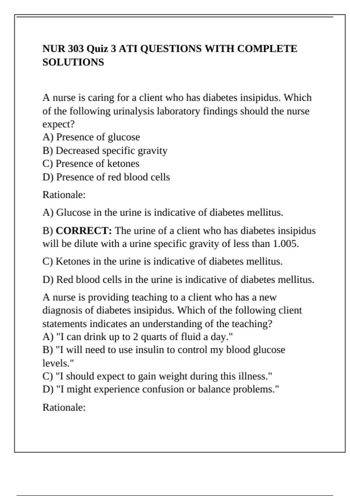 B) CORRECT: The urine of a client who has diabetes insipidus