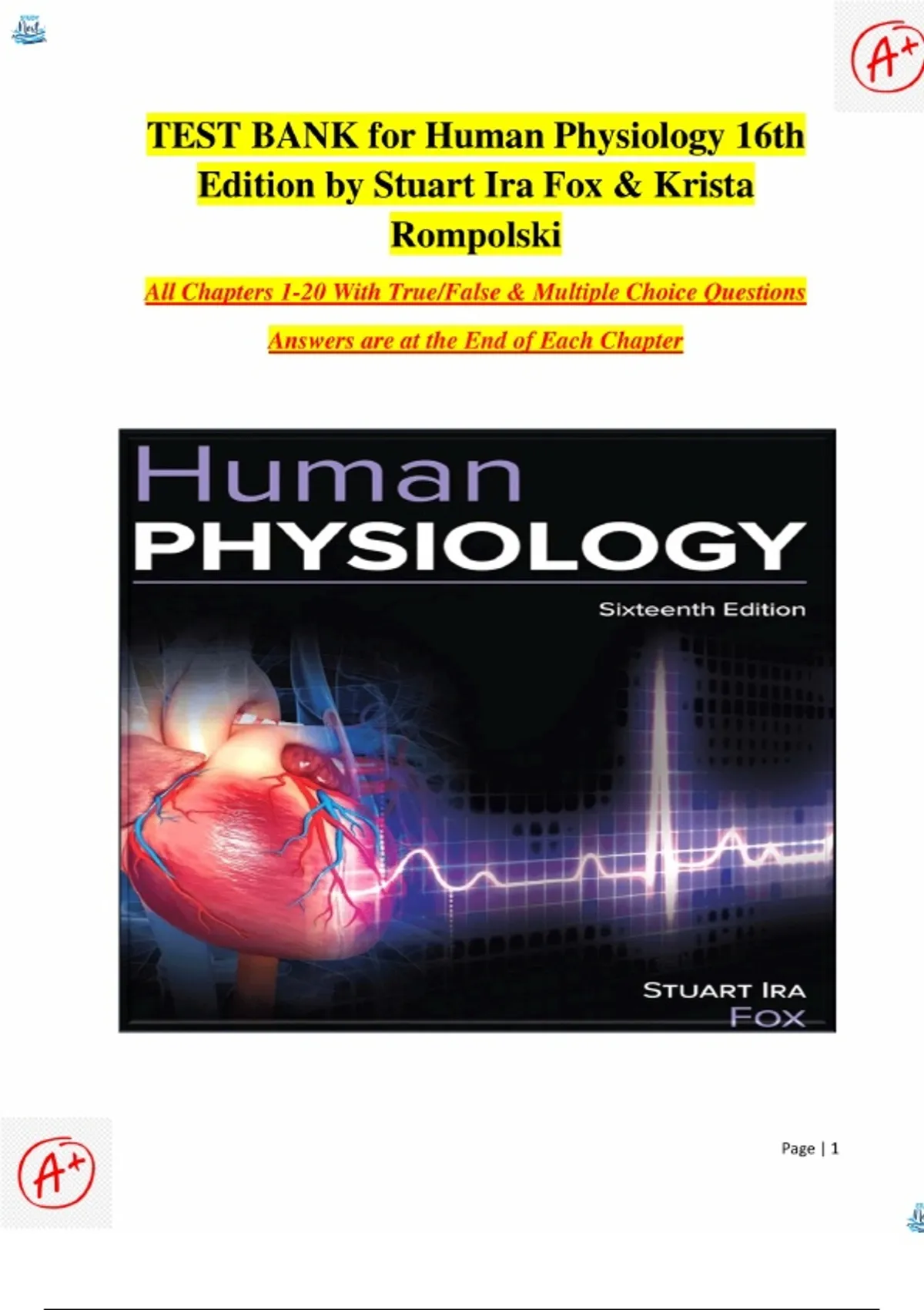 Test bank for Human Physiology 16th Edition by Stuart Ira Fox & Krista Rompolski.|All chapters covered, Complete test guide.|Graded A+