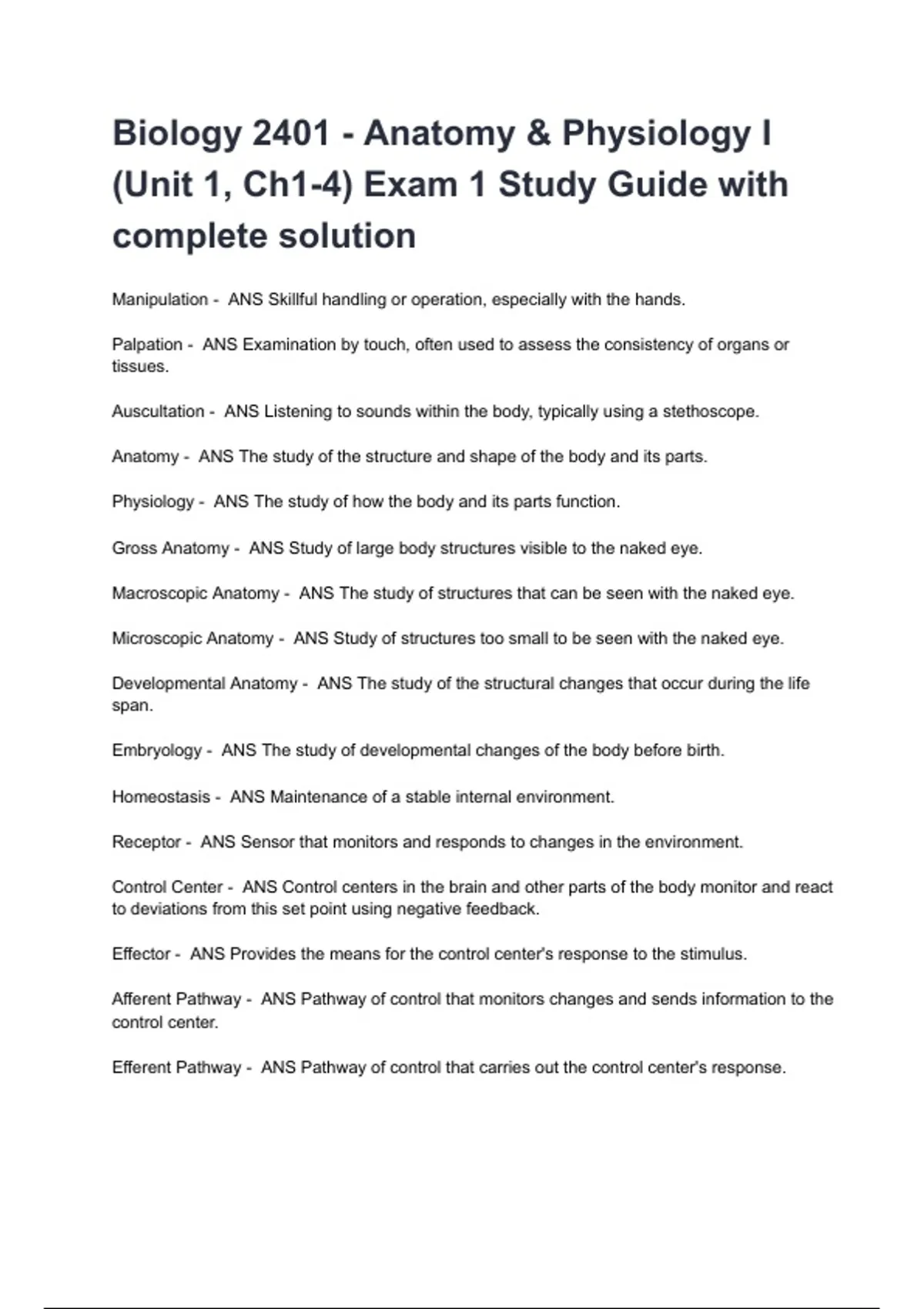 Biology 2401 - Anatomy & Physiology I (Unit 1, Ch1-4) Exam 1 Study Guide with complete solution