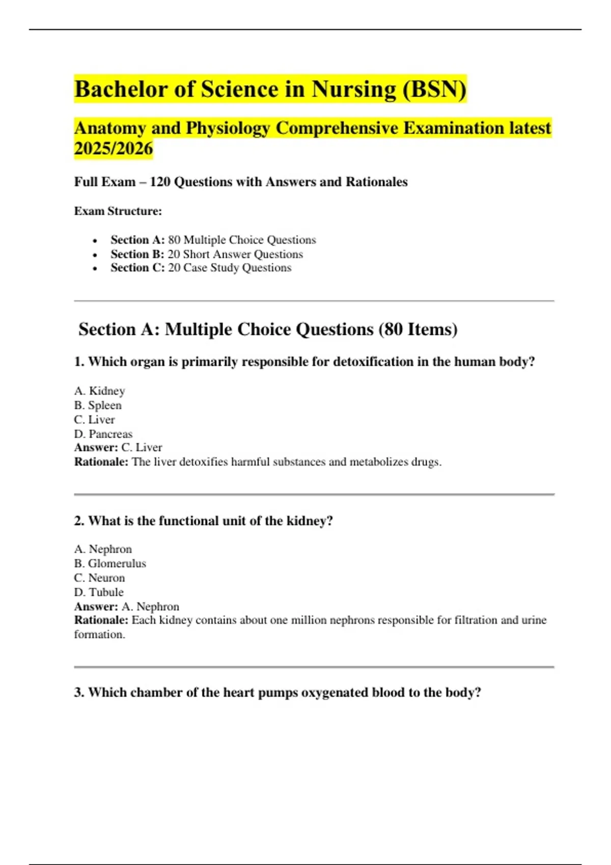 Bachelor of Science in Nursing (BSN) Anatomy and Physiology Comprehensive Examination latest 2025/2026