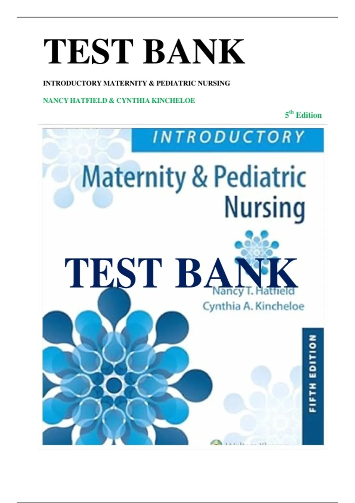 This comprehensive test bank accompanies Introductory Maternity & Pediatric Nursing (5th Edition) by Nancy Hatfield and Cynthia Kincheloe. It includes chapter-by-chapter multiple-choice and application-based questions with accurate, expert-verified answers. Covering essential topics in maternal, newborn, and pediatric nursing, this resource is designed to help students master key nursing concepts, prepare for exams, and strengthen clinical reasoning skills.