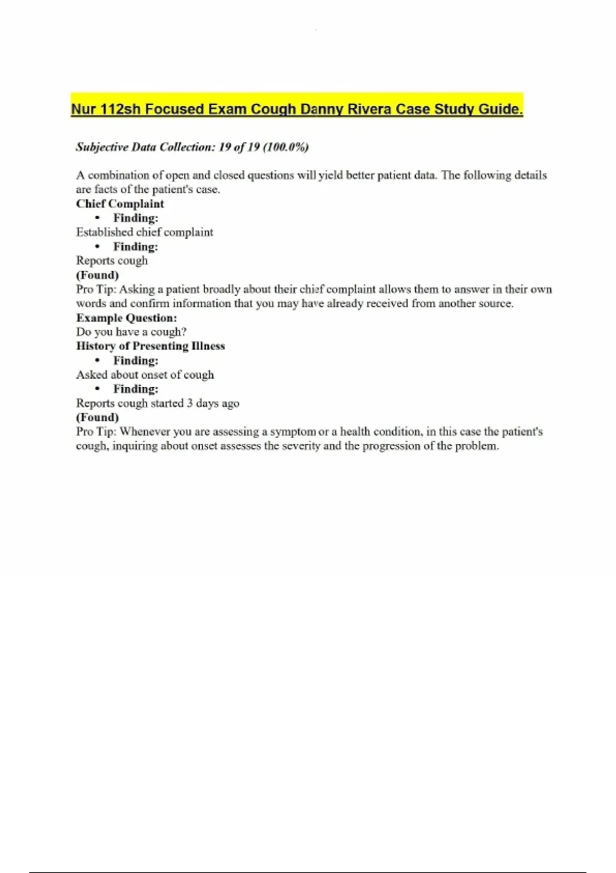 Nur 112sh Focused Exam Cough Danny Rivera Case Study Guide.