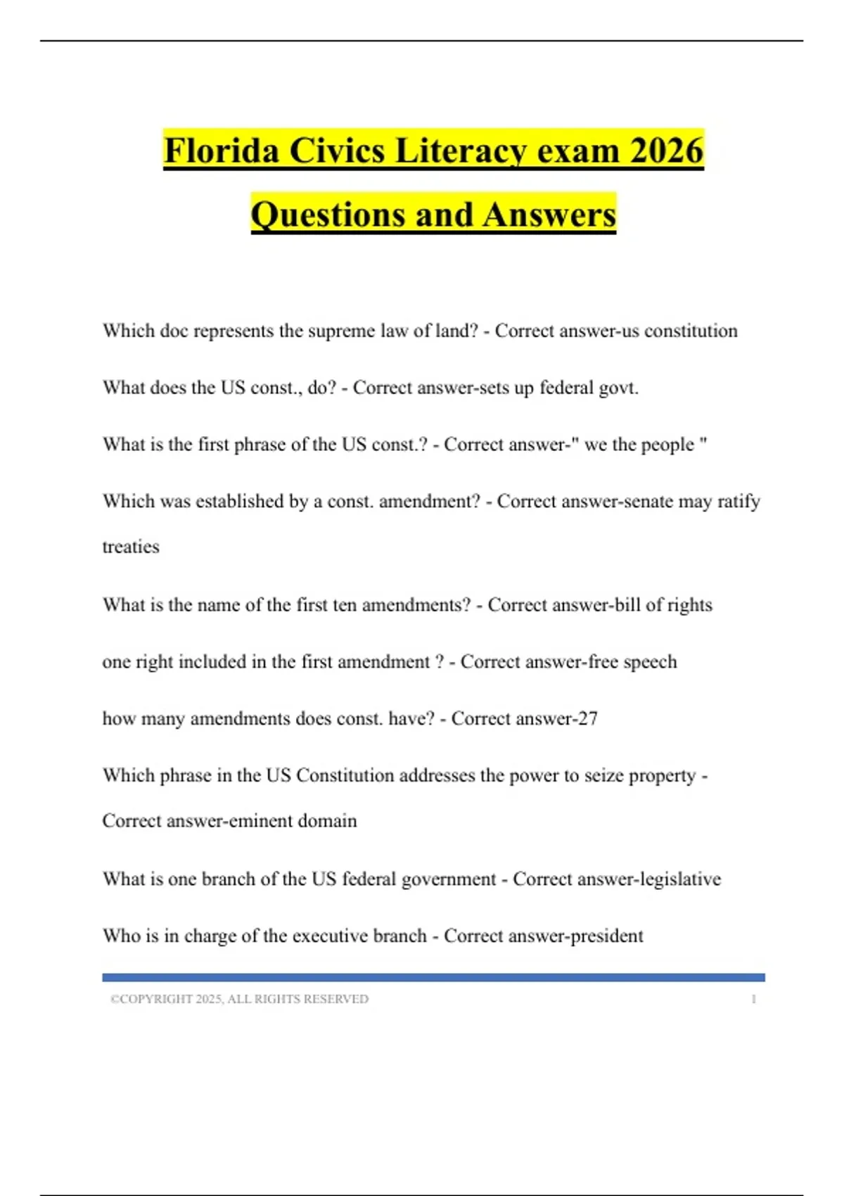 Which doc represents the supreme law of land? - Correct answer-us constitution