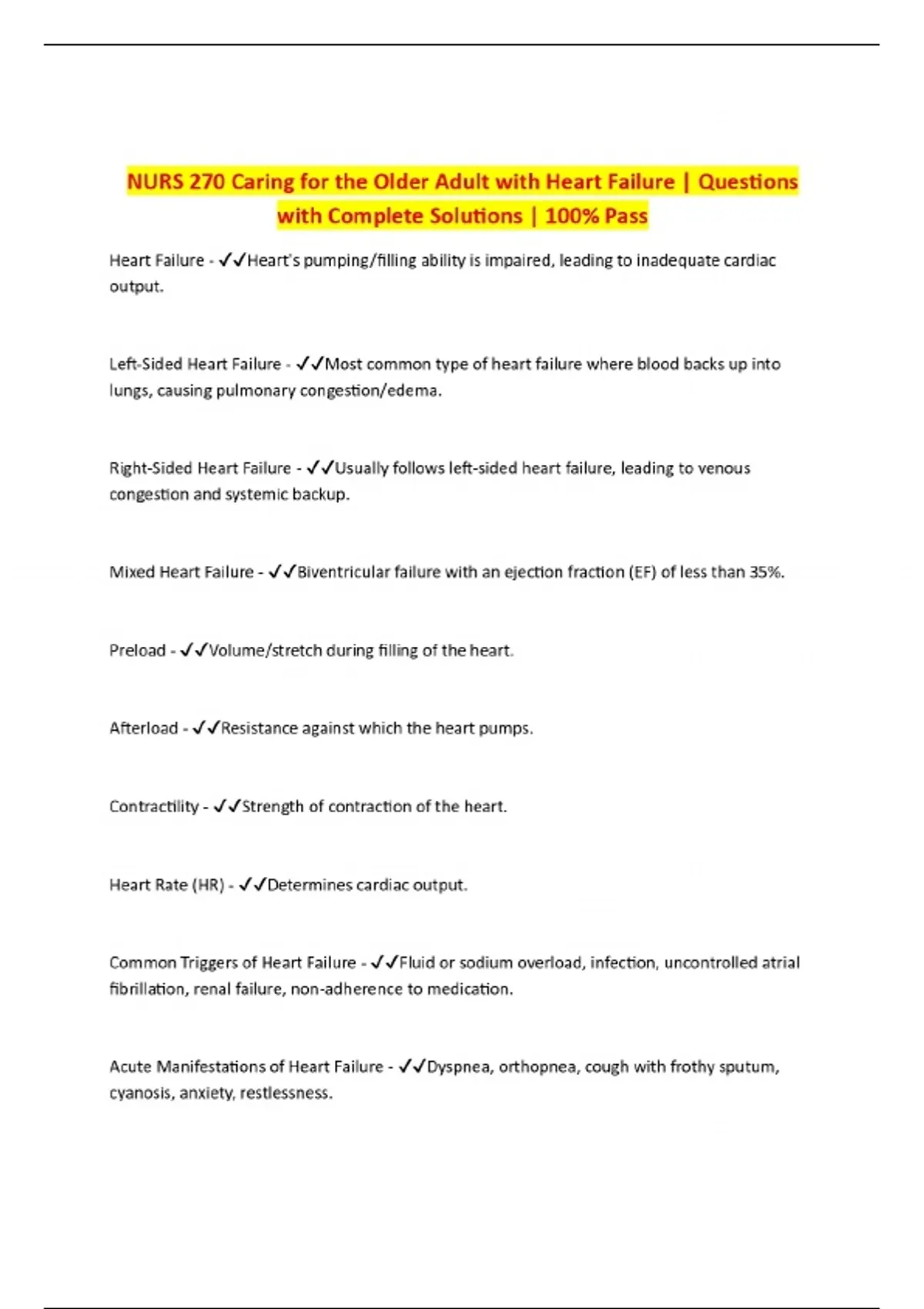NURS 270 Caring for the Older Adult with Heart Failure | Questions with Complete Solutions | 100% Pass