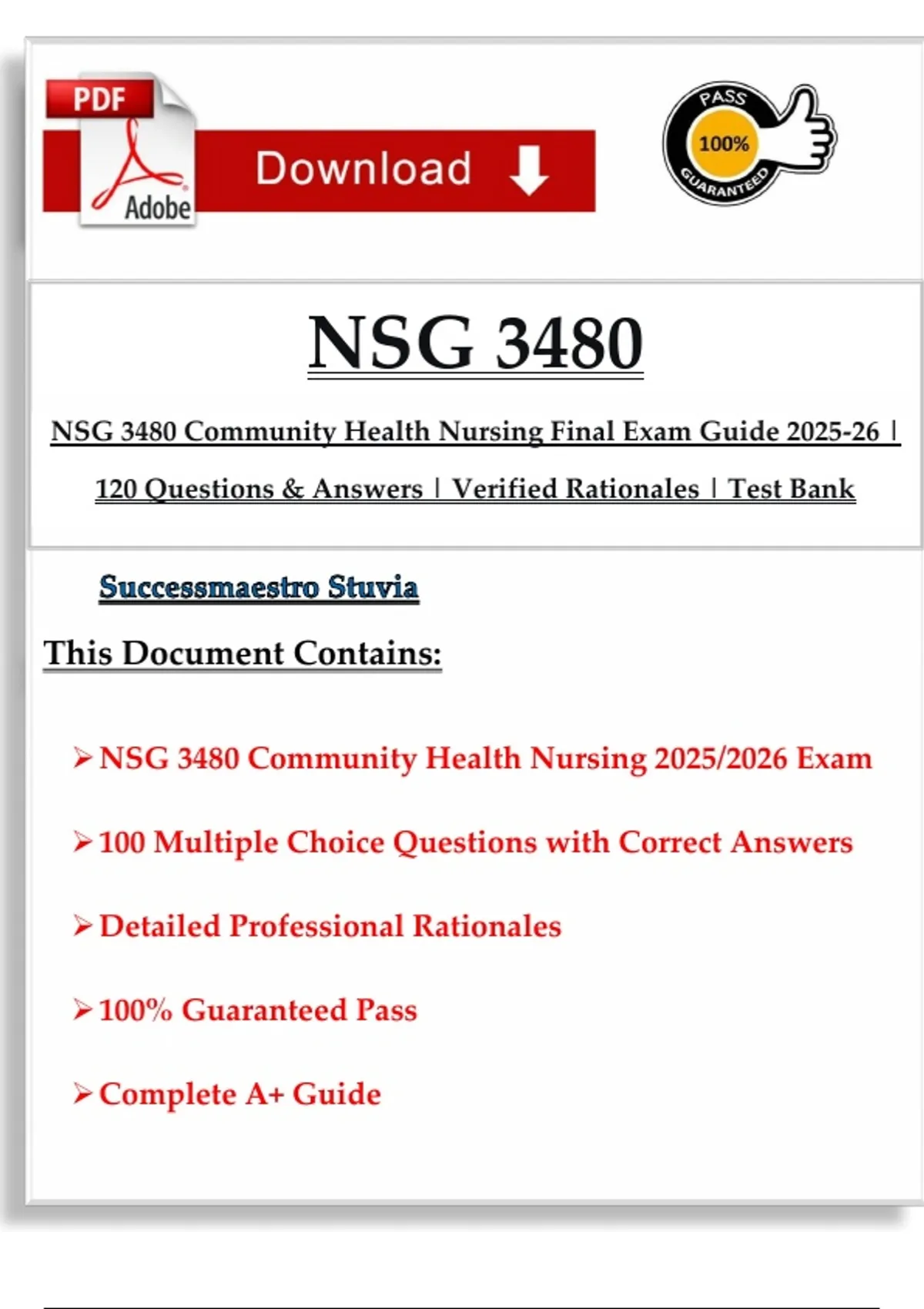 NSG 3480 Community Health Nursing Final Exam Guide 2025-26 | 120 Questions & Answers | Verified Rationales | Test Bank. "Ace your NSG 3480 Community Health Nursing final exam with this ultimate 120-question test bank. This meticulously crafted resource is designed for nursing students to master the core concepts of public health, epidemiology, and population-focused care. Each multiple-choice question is accompanied by a detailed, evidence-based rationale that explains not just the correct answer, but also why the other options are incorrect.