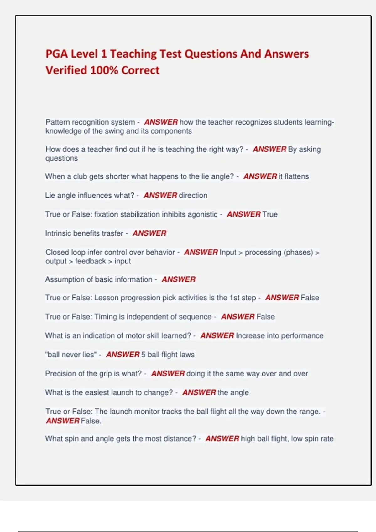 PGA Level 1 Teaching Test Questions And Answers Verified 100% Correct Pattern recognition system - ANSWER how the teacher recognizes students learning- knowledge of the swing and its components How does a teacher find out if he is teaching the right way? - ANSWER By asking questions When a club gets shorter what happens to the lie angle? - ANSWER it flattens Lie angle influences what? - ANSWER direction True or False: fixation stabilization inhibits agonistic - ANSWER True Intrinsic benefits trasfer - ANSWER Closed loop infer control over behavior - ANSWER Input > processing (phases) > output > feedback > input Assumption of basic information - ANSWER True or False: Lesson progression pick activities is the 1st step - ANSWER False True or False: Timing is independent of sequence - ANSWER False What is an indication of motor skill learned? - ANSWER Increase into performance "ball never lies" - ANSWER 5 ball flight laws Precision of the grip is what? - ANSWER doing it the same way over and over What is the easiest launch to change? - ANSWER the angle True or False: The launch monitor tracks the ball flight all the way down the range. - ANSWER False. What spin and angle gets the most distance? - ANSWER high ball flight, low spin rate What controls the spin rate with everything squared? - ANSWER angle of approach What is the most important alignment factor? - ANSWER Body position Positioning of the grip refers to - ANSWER clock wise placement on grip Release of energy is measured by what? - ANSWER coefficient of restitution Connection relates to all body parts - ANSWER What has the most leverage is the swing? - ANSWER Bones Out-to-in open face will result in what ball flight? - ANSWER pull slice Pre-seminar - ANSWER practice one skill at a time How do you keep a student interested? - ANSWER Focus on one skill No matter what the teacher teaches what will not be affected? - ANSWER Ball flight laws What does breaking you left wrist affect? - ANSWER It adds loft Anterior lower back tilt flaw can cause what? - ANSWER Lower cross syndrome What is the lie angles effect on ball flight? - ANSWER Direction stretch- shortening cycle - ANSWER Skeletal position provides what? - ANSWER Structure Leverage System - ANSWER When the 2nd leverage works 3rd lever change the distance What is the 2nd level in the swing? - ANSWER shoulder Small hands with weak grip, what kind of grip - ANSWER 10 finger Rounded shoulders and head forward - ANSWER narrow swing What does lower back tilt change? - ANSWER hip slide and spine angle Upper Cross Syndrome - ANSWER stretch your chest True or False: Upper and lower cross syndrome and reciprocal inhibition - ANSWER False What is the best way to teach juniors? - ANSWER experimenting How long does short term memory last? - ANSWER 1 min True or False, should try to have 5 lesson goals - ANSWER False, 1-3 How can you keep the students focused (point to point)? - ANSWER By asking questions. SMART, what does the M stand for? - ANSWER Meaningful Intrinsic and Augment feed are what: - ANSWER both motivated True or False: Centeredness is when the club face and body connect - ANSWER False What do you take with you from early (cognitive) to intermediate (associative)? - ANSWER Movement is more autonomous What is the easiest static performance - ANSWER Launch angle True or False: Driver is closed or open is the same as the lie angle to an iron - ANSWER False What is the ball flight when CPM is too high? - ANSWER Low right On a pitch shot you want to be - ANSWER right over it On a chip shot you want - ANSWER Your hands ahead What would the right activities to perform a lesson? - ANSWER Correspond with goals (align) What is the purpose of the skeletal system? - ANSWER The movement of joints Is feet placement a law, principle , or preference? - ANSWER Preference What is kick point? - ANSWER The bend of the shaft Skilled teachers want their students to become - ANSWER autonomous