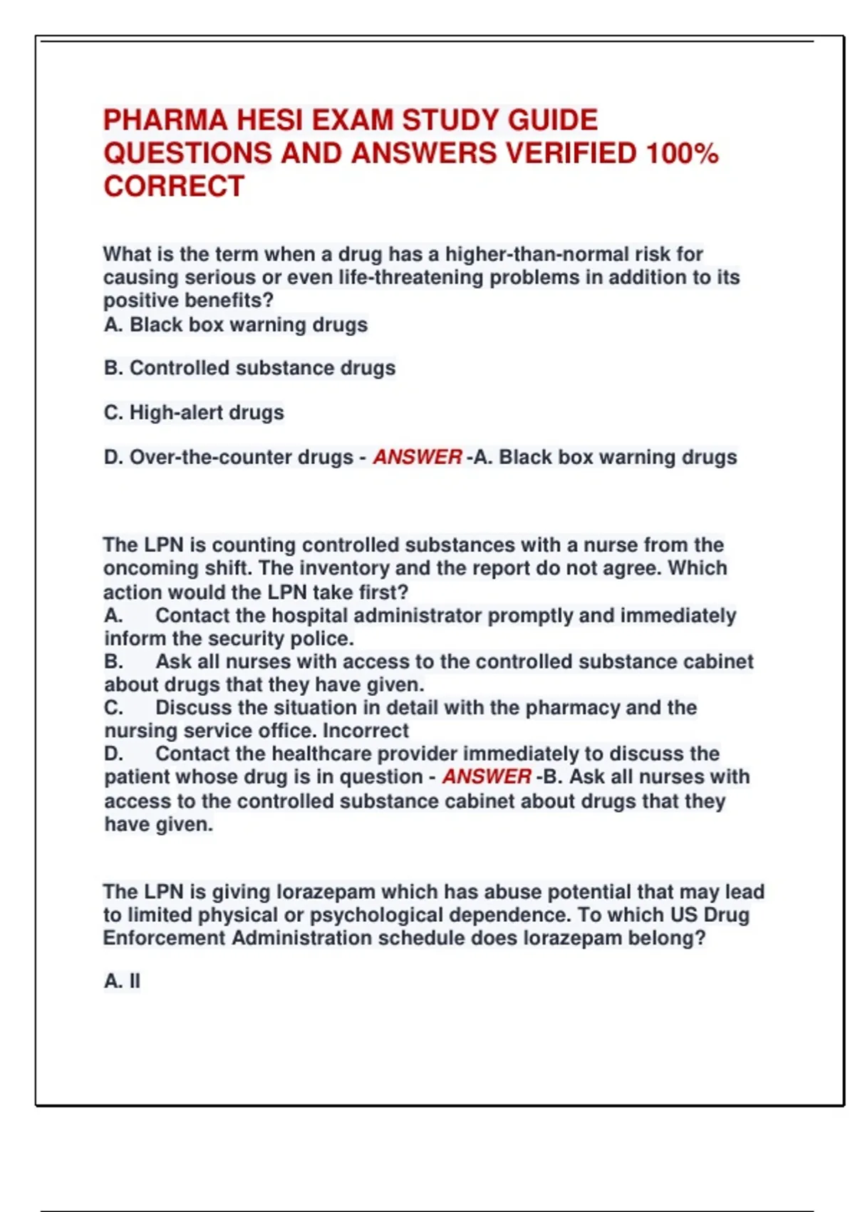 PHARMA HESI EXAM STUDY GUIDE QUESTIONS AND ANSWERS VERIFIED 100% CORRECT What is the term when a drug has a higher-than-normal risk for causing serious or even life-threatening problems in addition to its positive benefits? A. Black box warning drugs B. Controlled substance drugs C. High-alert drugs D. Over-the-counter drugs - ANSWER -A. Black box warning drugs The LPN is counting controlled substances with a nurse from the oncoming shift. The inventory and the report do not agree. Which action would the LPN take first? A. Contact the hospital administrator promptly and immediately inform the security police. B. Ask all nurses with access to the controlled substance cabinet about drugs that they have given. C. Discuss the situation in detail with the pharmacy and the nursing service office. Incorrect D. Contact the healthcare provider immediately to discuss the patient whose drug is in question - ANSWER -B. Ask all nurses with access to the controlled substance cabinet about drugs that they have given. The LPN is giving lorazepam which has abuse potential that may lead to limited physical or psychological dependence. To which US Drug Enforcement Administration schedule does lorazepam belong? A. II B. III C. IV D. V - ANSWER -C. IV The LPN is giving oxycodone which has abuse potential that may lead to severe psychological or physical dependence. To which US Drug Enforcement Administration schedule does oxycodone belong? A. II B. III C. IV D. V - ANSWER -A. II The LPN receives a one-time order from a healthcare provider for a drug to be given at a specific time. This scenario describes which type of order? A. A stat order B. A single order C. A standing order D. A PRN order - ANSWER -B. A single order The LPN receives an order from a healthcare provider for a drug that can be given as needed based on the nurse's judgment. This scenario describes which type of order? A. A stat order B. A single order C. A standing order D. A PRN order - ANSWER -D. A PRN order Which drug is classified as a schedule III drug? A. Lorazepam B. Oxycodone C. Aspirin/butalbital/caffeine D. Diazepam - ANSWER -C. Aspirin/butalbital/caffeine Which federal law classifies the degree of control and recordkeeping required for each of the five classes of controlled substances? A. Proprietary or Patent Medicine Act B. The Federal Food, Drug, and Cosmetic Act C. The Controlled Substances Act D. The Federal Prescription Drug Marketing Act - ANSWER -C. The Controlled Substances Act An LPN asks the RN charge nurse to supervise the administration of hydromorphone to a postoperative patient. Which statement accurately describes hydromorphone? A. Hydromorphone is a controlled substance. B. Hydromorphone works to prevent stomach ulcers. C. Hydromorphone is an over-the-counter drug.