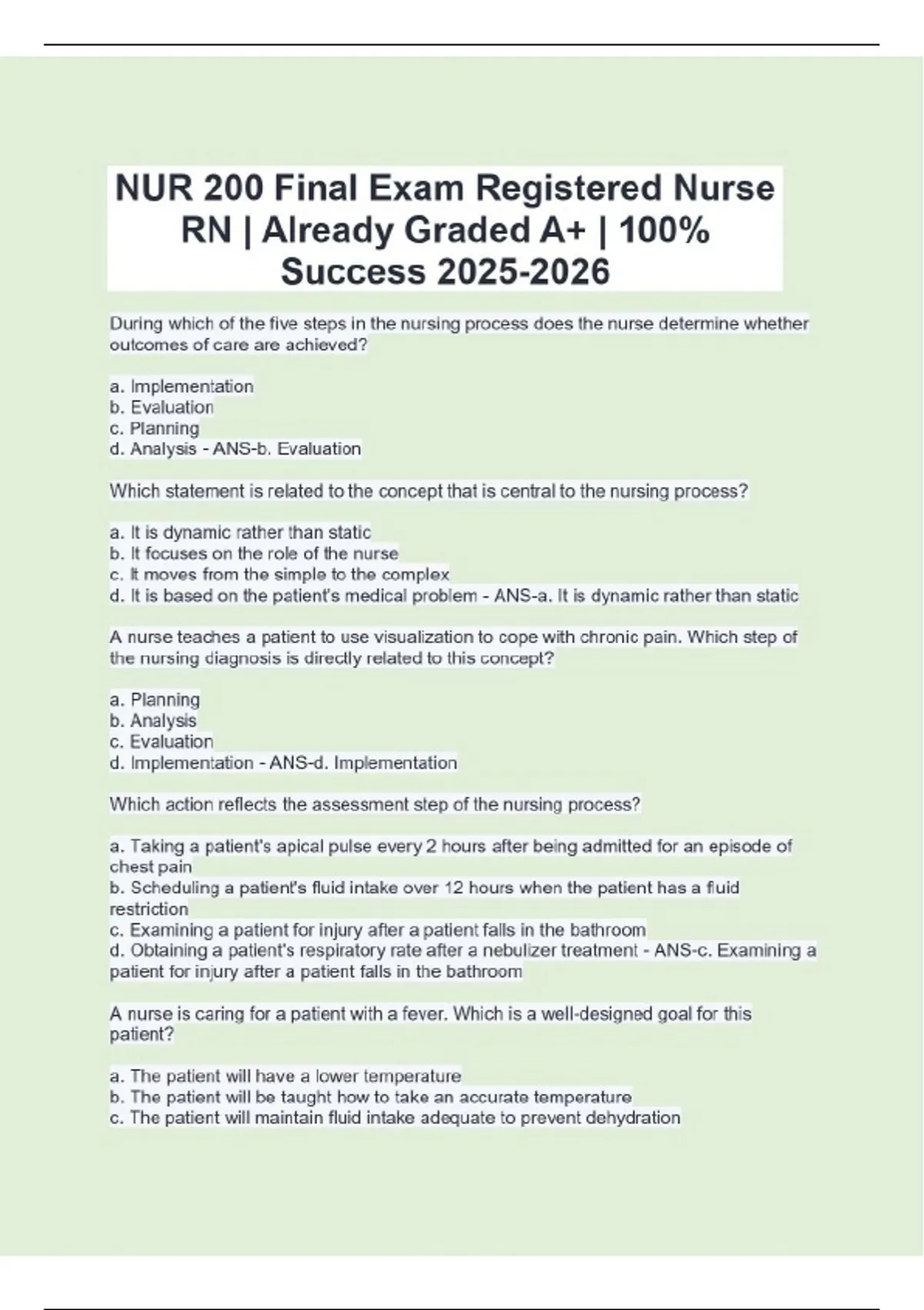 NUR 200 Final Exam Registered Nurse RN | Already Graded A+ | 100% Success During which of the five steps in the nursing process does the nurse determine whether outcomes of care are achieved? a. Implementation b. Evaluation c. Planning d. Analysis - ANS-b. Evaluation Which statement is related to the concept that is central to the nursing process? a. It is dynamic rather than static b. It focuses on the role of the nurse c. It moves from the simple to the complex d. It is based on the patient's medical problem - ANS-a. It is dynamic rather than static A nurse teaches a patient to use visualization to cope with chronic pain. Which step of the nursing diagnosis is directly related to this concept? a. Planning b. Analysis c. Evaluation d. Implementation - ANS-d. Implementation Which action reflects the assessment step of the nursing process? a. Taking a patient's apical pulse every 2 hours after being admitted for an episode of chest pain b. Scheduling a patient's fluid intake over 12 hours when the patient has a fluid restriction c. Examining a patient for injury after a patient falls in the bathroom d. Obtaining a patient's respiratory rate after a nebulizer treatment - ANS-c. Examining a patient for injury after a patient falls in the bathroom A nurse is caring for a patient with a fever. Which is a well-designed goal for this patient? a. The patient will have a lower temperature b. The patient will be taught how to take an accurate temperature c. The patient will maintain fluid intake adequate to prevent dehydration d. The patient will be given aspirin every eight hours whenever necessary - ANS-c. The patient will maintain fluid intake adequate to prevent dehydration During which step of the nursing process does determining which actions will be employed to meet the needs of a patient occur? a. Implementation b. Assessment c. Planning d. Analysis - ANS-c. Planning Which is the primary goal of the assessment phase of the nursing process? a. Build trust b. Collect data c. Establish goals d. Validate the medical diagnosis - ANS-b. Collect data When two nursing diagnoses appear closely related, which should the nurse do first to determine which diagnosis most accurately reflects the needs of the patient? a. Reassess the patient b. Examine the related to factors c. Analyze the secondary to factors d. Review the defining characteristics - ANS-d. Review the defining characteristics Which is the primary reason why a nurse performs a physical assessment of a newly admitted patient? a. Identify if the patient is at risk for falls b. Ensure that the patient's skin is totally intact c. Identify important information about the patient d. Establish a therapeutic relationship with the patient - ANS-c. Identify important information about the patient A nurse evaluates a patient's response to a nursing intervention. To which aspect of the nursing process is this evaluation most directly related? a. Goal b. Problem c. Etiology d. Implementation - ANS-a. Goal A nurse is caring for a patient with a urinary elimination problem. Which are the accurately stated goals? SELECT ALL THAT APPLY a. The patient will be taught how to use a bedpan while on bedrest b. The patient will experience fewer incontinence episodes at night c. The patient will transfer independently and safely to a toilet before discharge d. The patient will be assisted to the commode every 2 hours and whenever necessary e. The patient will experience one or less events of urinary incontinence daily within 6 weeks - ANS-c. The patient will transfer independently and safely to a toilet before discharge e. The patient will experience one or less events of urinary incontinence daily within 6 weeks Which human responses identified by the nurse are examples of objective data? SELECT ALL THAT APPLY a. Irregular radial pulse of 50 b. Wheezing on expiration c. Temp of 99F d. Shortness of breath e. Dizziness - ANS-a. Irregular radial pulse of 50 b. Wheezing on expiration c. Temp of 99F A nurse is interviewing a patient. Which patient statements are examples of objective data? SELECT ALL THAT APPLY a. I am hungry b. I feel very warm c. I ate half my lunch d. I have a rash on my arm e. I have the urge to urinate f. I vomit every time I eat something - ANS-c. I ate half my lunch d. I have a rash on my arm f. I vomit every time I eat something A nurse is interviewing a patient at the change of shift. Which patient statements reflect subjective data? SELECT ALL THAT APPLY ....