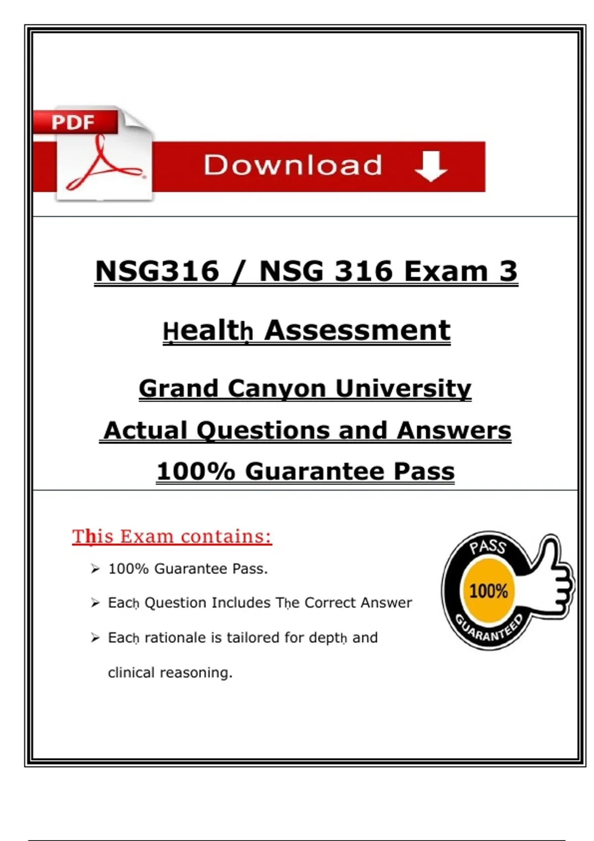 INSTANT DOWNLOAD PDF – This NSG 316 Exam 3 Health Assessment resource from Grand Canyon University (GCU) features the most up-to-date 2025 / 2026 actual exam questions with detailed rationalized answers. Topics include reproductive health, mental status assessment, skin and lymphatics, documentation, and clinical decision-making. Perfect for GCU nursing students preparing for success in Exam 3 of NSG 316. NSG 316 Exam 3 GCU, health assessment GCU exam, rationalized answers NSG316, Grand Canyon University nursing, NSG 316 prep, mental status assessment nursing, skin and lymphatic assessment quiz, reproductive health exam questions, NSG 316 study guide PDF, GCU nursing school test prep, documentation and reporting nursing, clinical judgment nursing exam, NSG 316 multiple choice questions, nursing exam rationales GCU, advanced health assessment review, GCU health systems exam, NSG 316 nursing test bank, Grand Canyon NSG316 answers, nursing health exam prep, GCU physical assessment exam