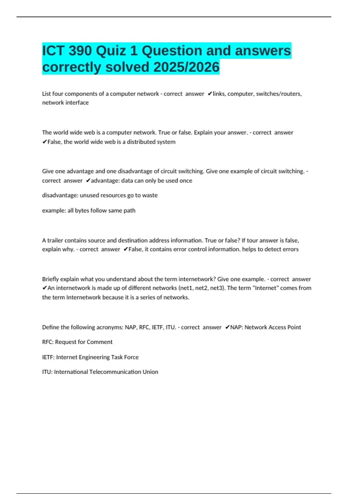 Define the following acronyms: NAP, RFC, IETF, ITU. - correct answer ✔NAP: Network Access Point