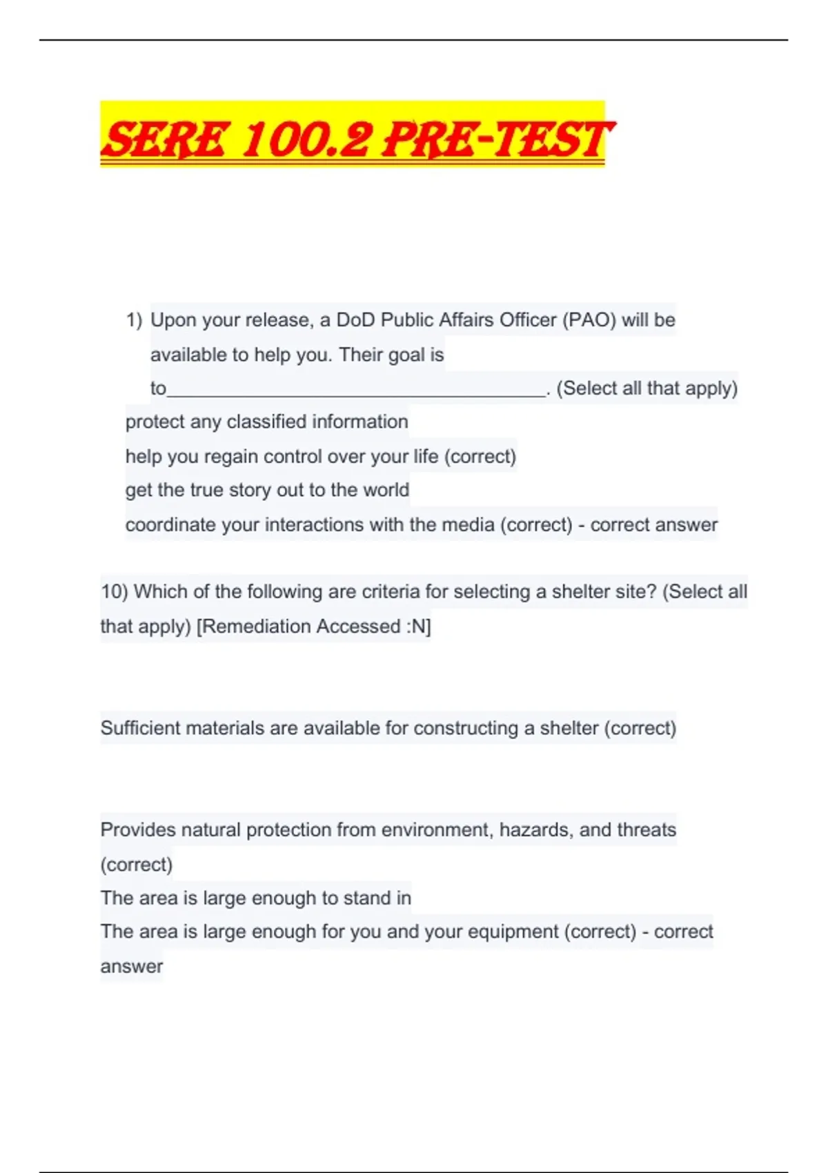 10) Which of the following are criteria for selecting a shelter site? (Select all