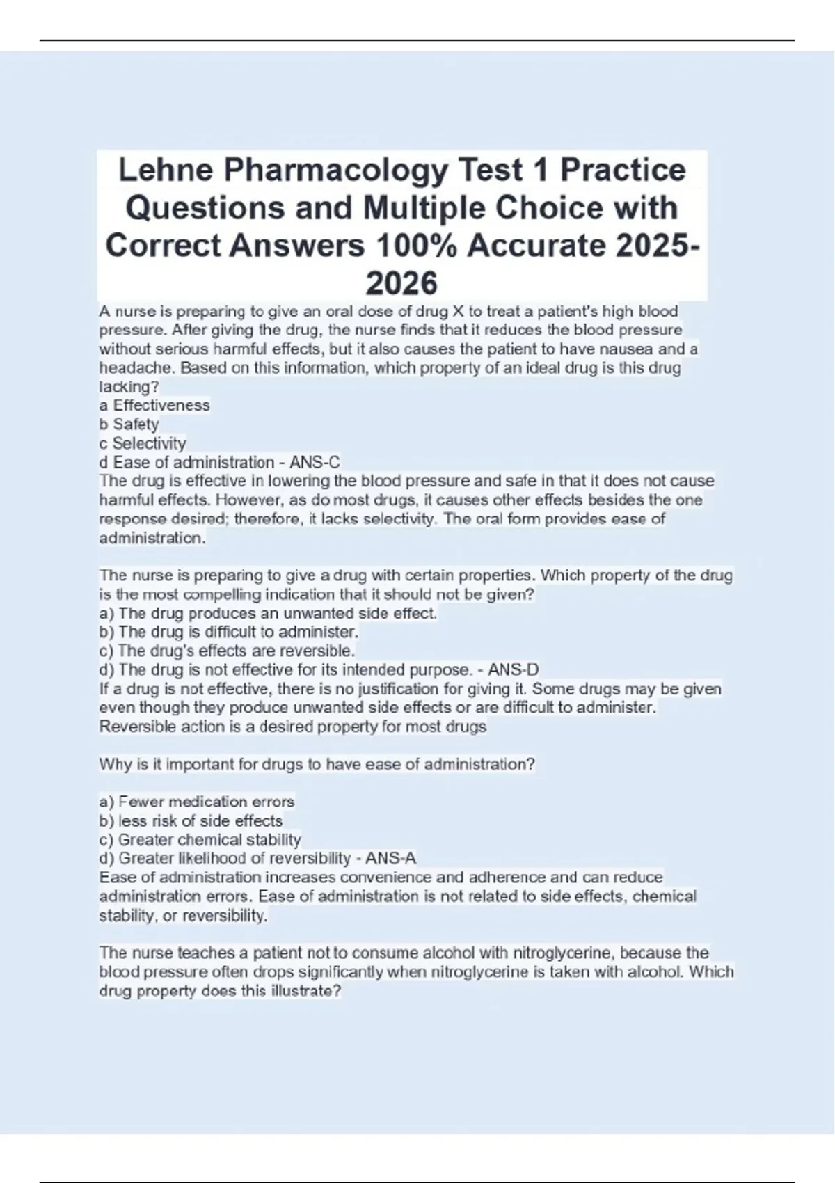 Lehne Pharmacology Test 1 Practice Questions and Multiple Choice with Correct Answers 100% Accurate A nurse is preparing to give an oral dose of drug X to treat a patient's high blood pressure. After giving the drug, the nurse finds that it reduces the blood pressure without serious harmful effects, but it also causes the patient to have nausea and a headache. Based on this information, which property of an ideal drug is this drug lacking? a Effectiveness b Safety c Selectivity d Ease of administration - ANS-C The drug is effective in lowering the blood pressure and safe in that it does not cause harmful effects. However, as do most drugs, it causes other effects besides the one response desired; therefore, it lacks selectivity. The oral form provides ease of administration. The nurse is preparing to give a drug with certain properties. Which property of the drug is the most compelling indication that it should not be given? a) The drug produces an unwanted side effect. b) The drug is difficult to administer. c) The drug's effects are reversible. d) The drug is not effective for its intended purpose. - ANS-D If a drug is not effective, there is no justification for giving it. Some drugs may be given even though they produce unwanted side effects or are difficult to administer. Reversible action is a desired property for most drugs Why is it important for drugs to have ease of administration? a) Fewer medication errors b) less risk of side effects c) Greater chemical stability d) Greater likelihood of reversibility - ANS-A Ease of administration increases convenience and adherence and can reduce administration errors. Ease of administration is not related to side effects, chemical stability, or reversibility. The nurse teaches a patient not to consume alcohol with nitroglycerine, because the blood pressure often drops significantly when nitroglycerine is taken with alcohol. Which drug property does this illustrate? a) Chemical instability b) Drug interaction c) Reversible action d) Drug selectivity - ANS-B When two or more drugs are taken together, they can interact, causing either increased or decreased drug responses. In this case, alcohol would increase the nitroglycerine response. Chemical instability, reversible action, and drug selectivity are not related to this situation. When studying the impact a drug has on the body, the nurse is reviewing what? a) The drug's pharmacokinetics b) The drug's selectivity c) The drug's pharmacodynamics d) The drug's predictability - ANS-C Pharmacodynamics can be thought of as the impact of drugs on the body. Pharmacokinetics describes the movement of drugs through the body. Selectivity is the ability of a drug to elicit only the response for which it is given. Predictability is the degree of certainty about how a patient will respond to a certain drug. When studying the effects of drugs in humans, the nurse is learning about what? a) Pharmacology b) Clinical pharmacology c) Therapeutics d) Effectiveness - ANS-B Clinical pharmacology is the study of the effects of drugs in humans. Pharmacology can be defined as the study of drugs and their interactions with living systems, Therapeutics, also known as pharmacotherapeutics, is the use of drugs to diagnose, prevent, or treat disease or to prevent pregnancy. The term effectiveness indicates that the drug elicits the intended response or responses. Which statement by a new nurse indicates that further study is indicated? A) Effectiveness is the most important property a drug can have. B) There is no such thing as a safe drug. C) Drugs are defined as illegal substances. D) There is no such thing as a selective drug; all medications cause side effects. - ANS-C A drug is any chemical that can affect living processes. All the other statements are correct. What is the ultimate concern for the nurse when administering a drug? A) Intensity of the response B) Dosage C) Route of administration D) Timing of administration - ANS-A The ultimate concern for the nurse when administering a drug is the intensity of the response, which is determined by the dosage size, route of administration, and timing of administration. The nurse is preparing to administer a dose of penicillin. Before administering the medication, the nurse assesses the patient's allergy history. Which aspect of drug therapy does this represent? A) Making PRN (as needed) decisions B) Evaluating therapeutic effects C)Ensuring proper dosage D)Identifying high-risk patients - ANS-D Patients receiving penicillin are at high risk for dangerous allergic reactions. This intervention represents the nurse's role in identifying situations with high risk. This situation does not represent the remaining responses. The nurse is preparing to administer a medication with the following order: "Aldomet 250 mg daily." What should the nurse do? A) Administer the medication as it was given last time. B) Administer the medication by mouth. C) Verify the order with the prescriber. Correct D) Ask the patient how this medication is usually given. - ANS-C This order does not include a drug route. The nurse should clarify any questionable orders with the prescriber. The other responses are incorrect. Which aspect of drug therapy indicates to the nurse whether a drug is having a beneficial effect? A) Performing a preadministration assessment B) Evaluating therapeutic responses Correct C) Minimizing adverse effects D) Managing toxicity - ANS-B Evaluation is one of the most important aspects of drug therapy, because it tells the nurse whether a drug is having its intended effect. The other aspects of drug administration are important but do not give information about a drug's effectiveness. The nurse is managing the care of a group of patients with cancer who will be receiving chemotherapy. The nurse defines goals, sets priorities, identifies interventions, and establishes criteria for evaluating success. Which phase of the nursing process does this represent? A) Assessment B) Pl