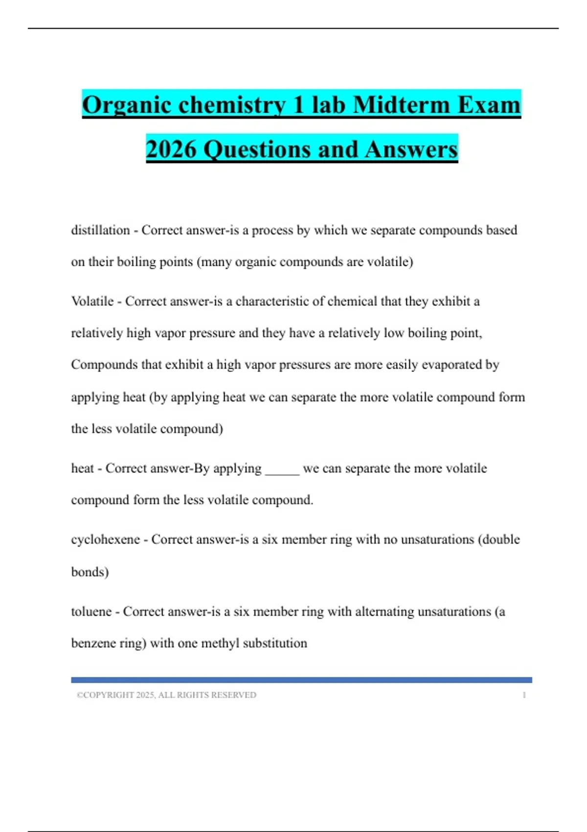 Organic chemistry 1 lab Midterm Exam 2026 Questions and Answers