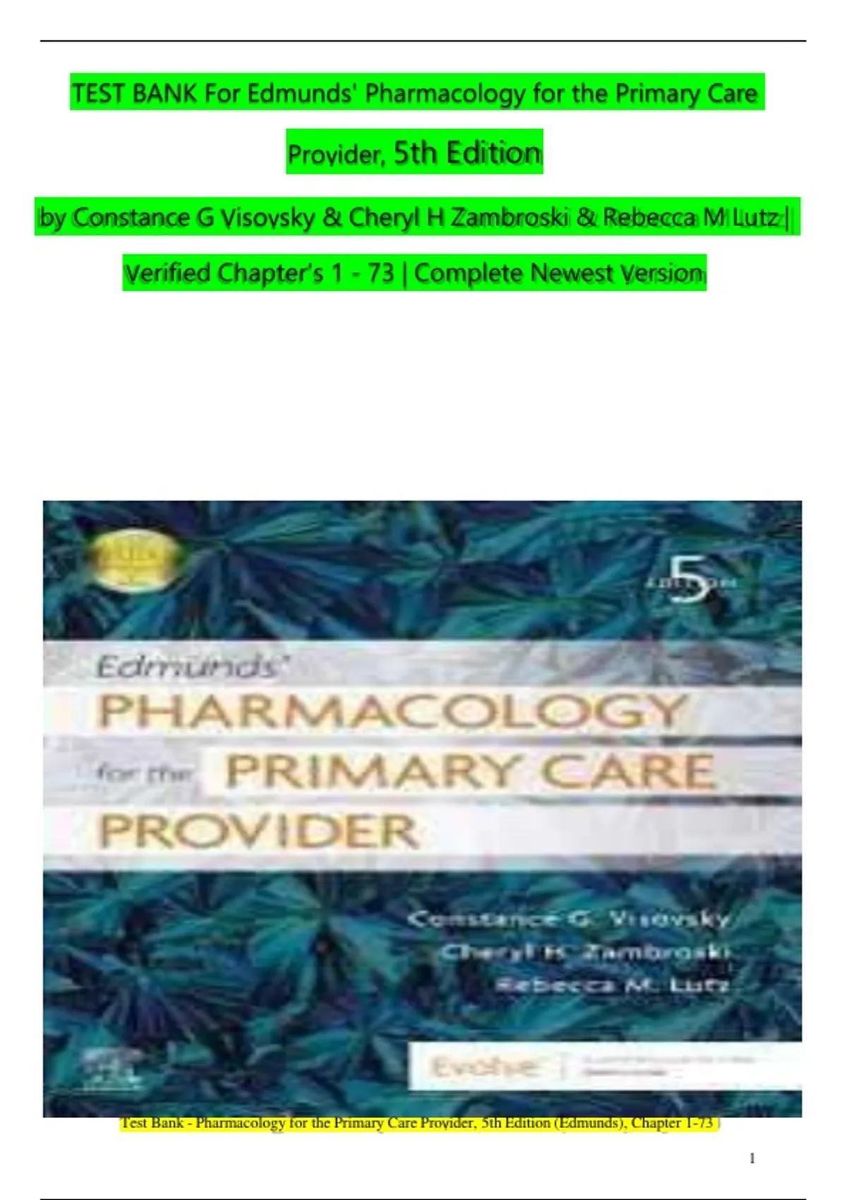 This complete TEST BANK covers Edmunds' Pharmacology for the Primary Care Provider, 5th Edition by Constance G. Visovsky (ISBN: 9780323661171) — fully updated and verified for accuracy. It includes all chapters 1–73, with detailed rationales, NCLEX-style questions, and correct answers to help you master pharmacological concepts for primary care. Ideal for nursing students, nurse practitioners, and pharmacology exam preparation. Edition: 5th Edition (Latest 2025 Verified Copy) Includes: All chapters (1–73) + Complete Answer Key Format: High-quality PDF, easy to read and searchable Perfect for: Nursing exams, pharmacology quizzes, NCLEX prep, and course reviews