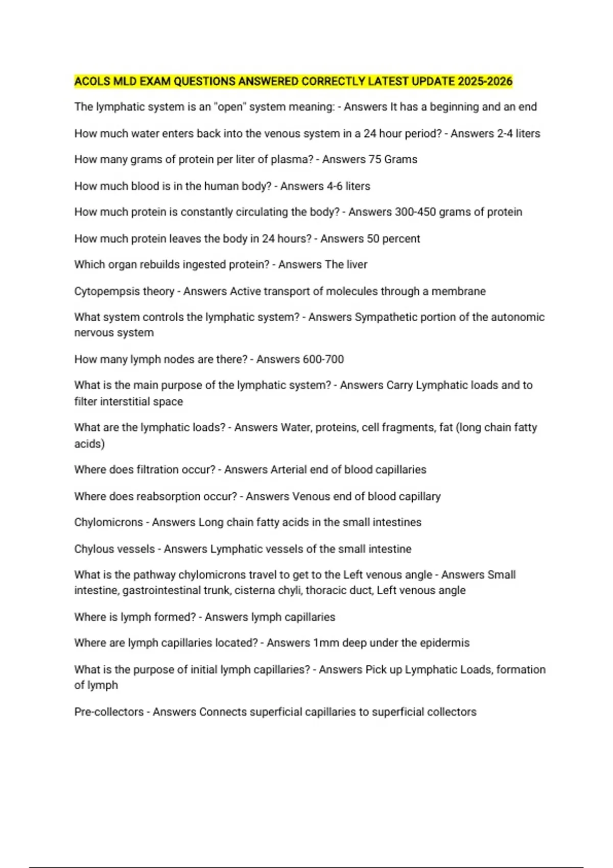 ACOLS MLD EXAM QUESTIONS ANSWERED CORRECTLY LATEST UPDATE The lymphatic system is an "open" system meaning: - Answers It has a beginning and an end How much water enters back into the venous system in a 24 hour period? - Answers 2-4 liters How many grams of protein per liter of plasma? - Answers 75 Grams How much blood is in the human body? - Answers 4-6 liters How much protein is constantly circulating the body? - Answers 300-450 grams of protein How much protein leaves the body in 24 hours? - Answers 50 percent Which organ rebuilds ingested protein? - Answers The liver Cytopempsis theory - Answers Active transport of molecules through a membrane What system controls the lymphatic system? - Answers Sympathetic portion of the autonomic nervous system How many lymph nodes are there? - Answers 600-700 What is the main purpose of the lymphatic system? - Answers Carry Lymphatic loads and to filter interstitial space What are the lymphatic loads? - Answers Water, proteins, cell fragments, fat (long chain fatty acids) Where does filtration occur? - Answers Arterial end of blood capillaries Where does reabsorption occur? - Answers Venous end of blood capillary Chylomicrons - Answers Long chain fatty acids in the small intestines Chylous vessels - Answers Lymphatic vessels of the small intestine What is the pathway chylomicrons travel to get to the Left venous angle - Answers Small intestine, gastrointestinal trunk, cisterna chyli, thoracic duct, Left venous angle Where is lymph formed? - Answers lymph capillaries Where are lymph capillaries located? - Answers 1mm deep under the epidermis What is the purpose of initial lymph capillaries? - Answers Pick up Lymphatic Loads, formation of lymph Pre-collectors - Answers Connects superficial capillaries to superficial collectors Perforating pre collectors - Answers Usually dormant, passes through fascia to connect superficial to deep lymphatic system Where are perforating pre collectors located? - Answers Parasternal, paravertebral, and intercostals Lymph collectors resemble: - Answers Pearl necklace What is the purpose of the lymph collectors? - Answers Transport lymph to regional lymph nodes and lymph trunks back to venous angle Where are lymph collectors located? - Answers Superficial fatty tissue Lymph angions - Answers Smooth muscle space between two valves of lymph collectors Valves are spaced: - Answers Every 0.6-10cm apart