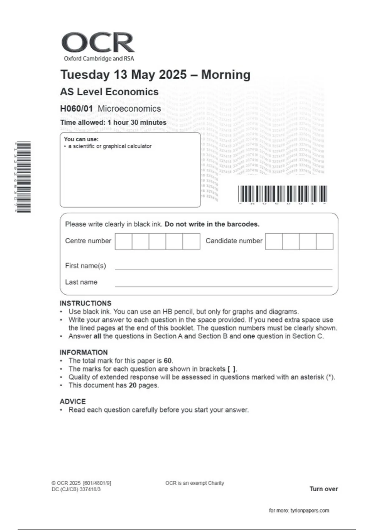 OCR AS Level Economics H060/01 JUNE 2025 QUESTION PAPER: Microeconomics