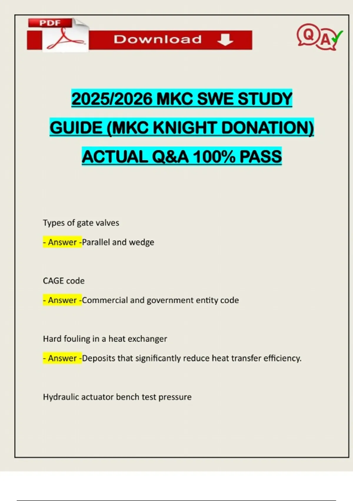 2025/2026 MKC SWE STUDY GUIDE (MKC KNIGHT DONATION) ACTUAL Q&A 100% PASS Types of gate valves - Answer -Parallel and wedge CAGE code - Answer -Commercial and government entity code Hard fouling in a heat exchanger - Answer -Deposits that significa