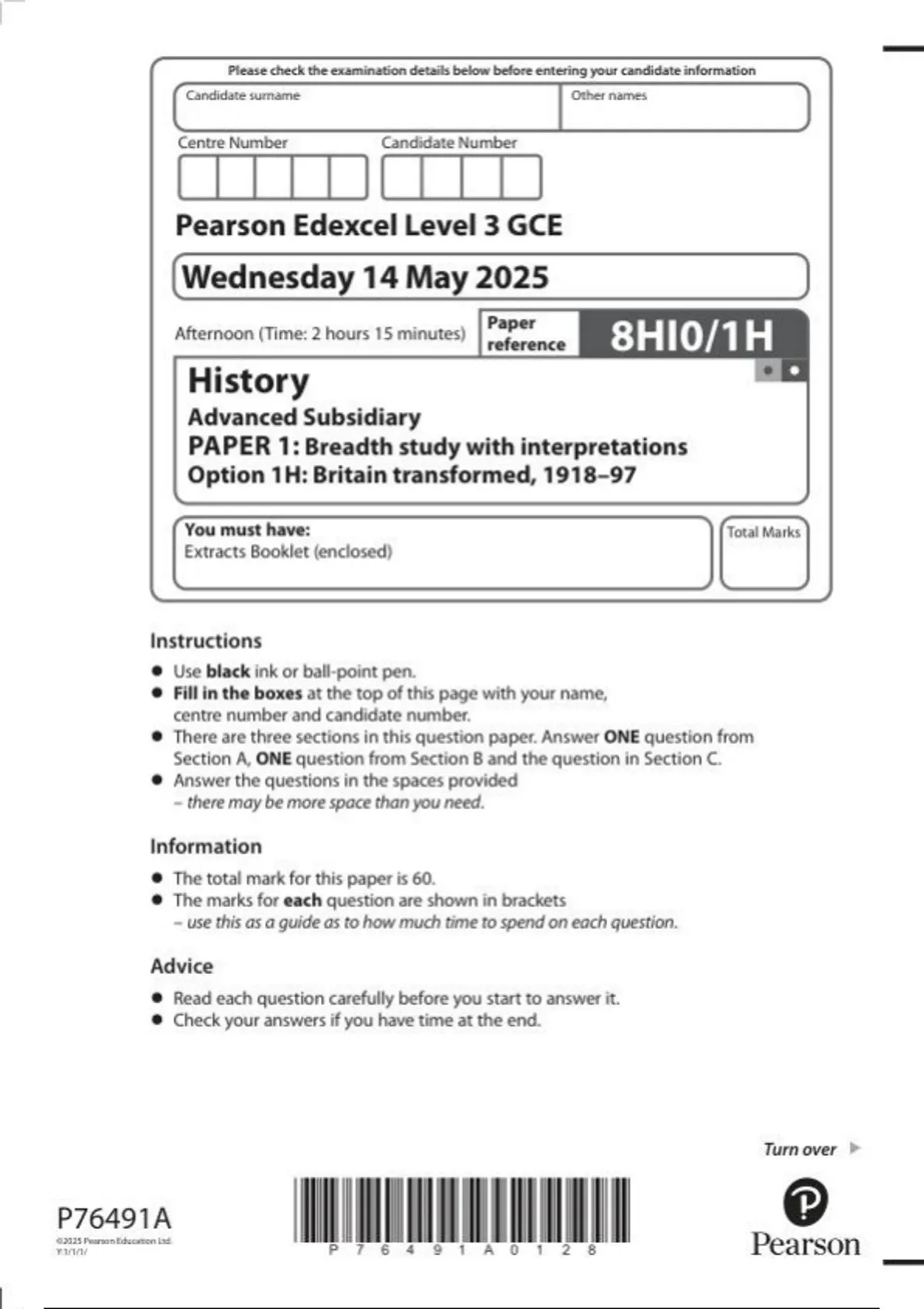 Pearson Edexcel as level History |question paper |2025|8HI0/1h
